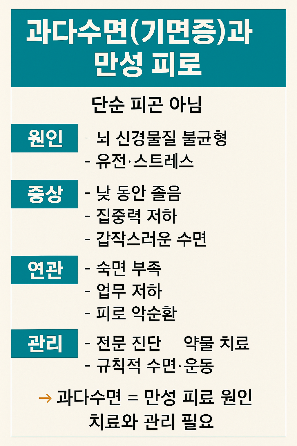 밤에 충분히 잤는데도 낮에 계속 졸리고, 피곤함이 사라지지 않는다면 단순한 피곤함이 아니라 **수면장애의 일종인 ‘과다수면(기면증)’**일 수 있습니다. 기면증은 단순한 졸음이 아니라 만성 피로를 유발하는 신경학적 질환으로, 방치하면 삶의 질에 큰 영향을 줄 수 있습니다. 오늘은 과다수면과 만성 피로의 연관성을 단계별로 살펴보겠습니다.