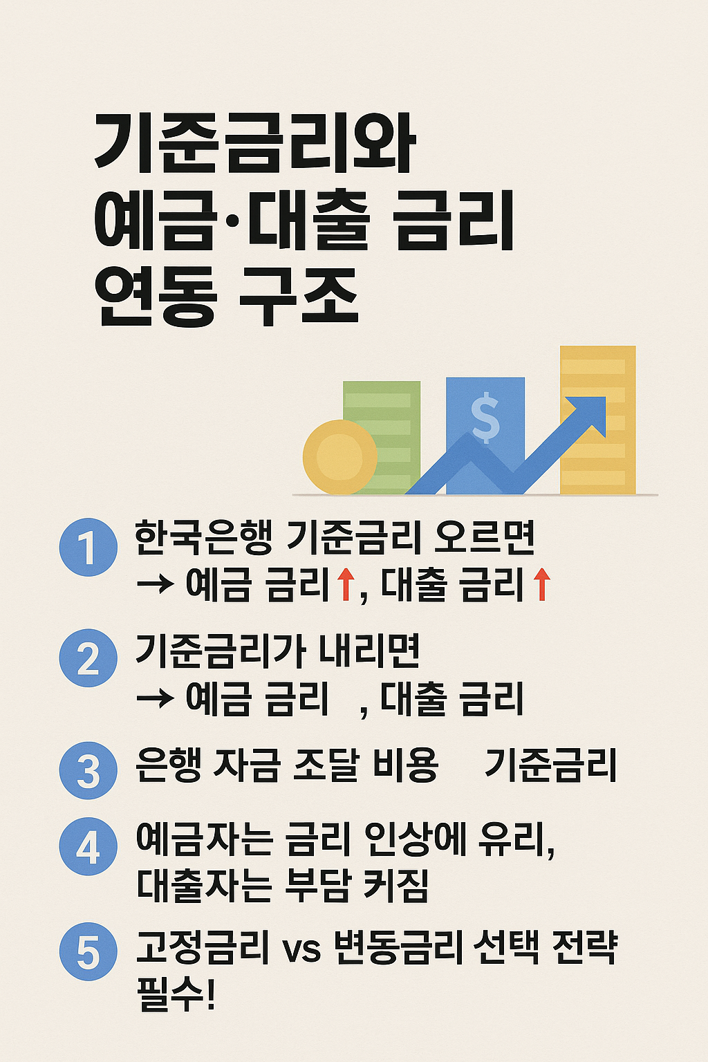 금융 뉴스를 보다 보면 “한국은행이 기준금리를 올렸다”는 기사가 자주 등장합니다. 그런데 기준금리가 변하면 왜 은행의 예·적금 금리나 대출 금리가 함께 바뀌는 걸까요? 오늘은 기준금리와 시중 금리의 연동 구조를 쉽게 풀어보겠습니다.