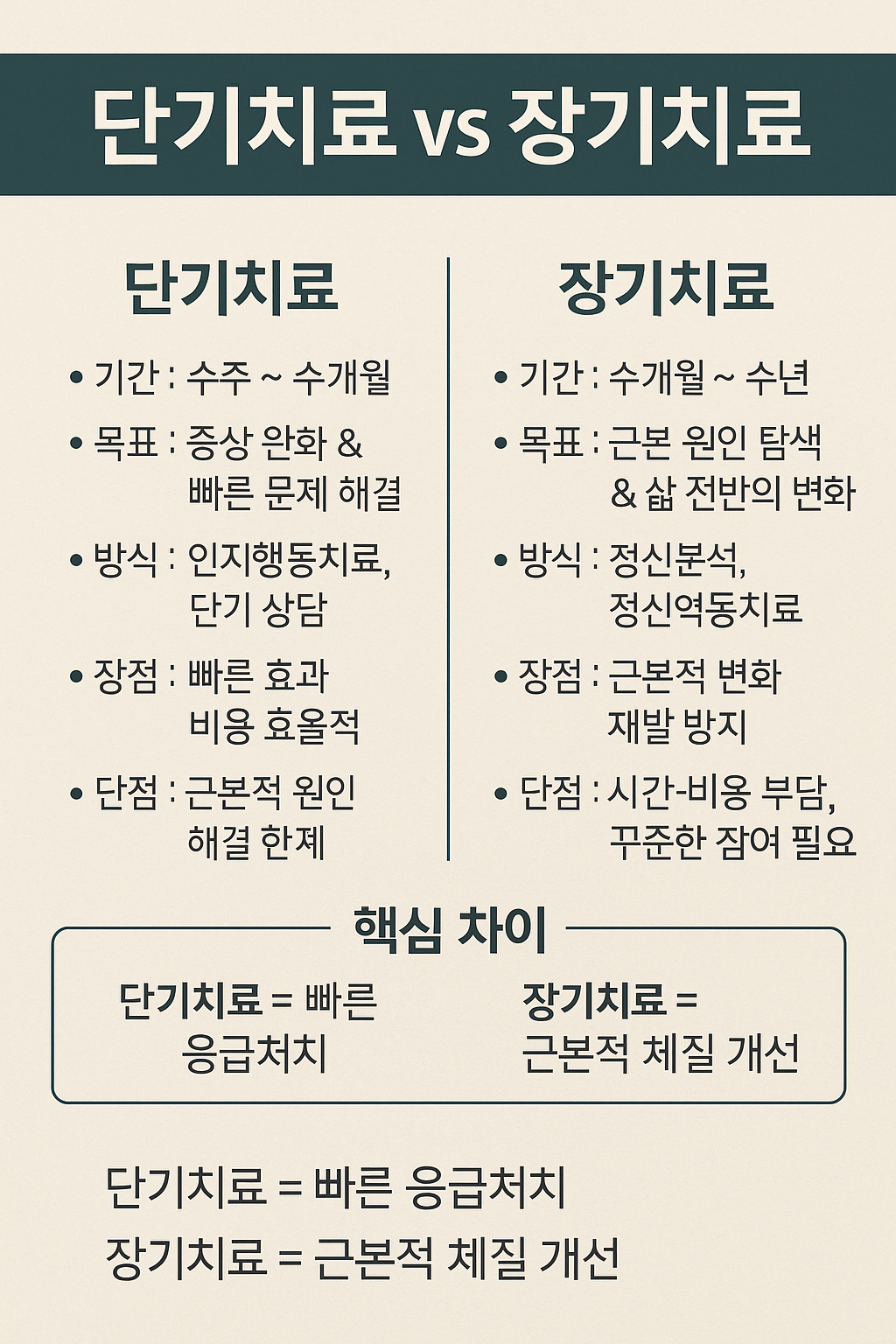 즉, 단기치료는 “빠른 응급처치”, 장기치료는 **“근본적 체질 개선”**이라고 비유할 수 있습니다.