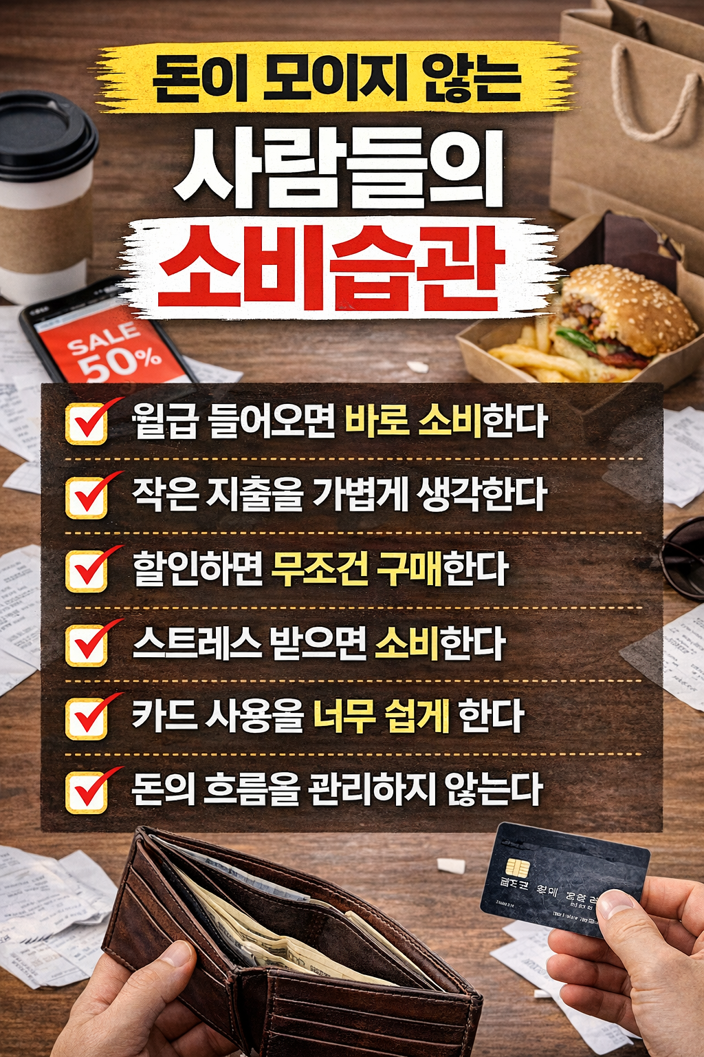 이번 글에서는 돈이 모이지 않는 사람들에게 공통적으로 나타나는 소비 습관을 정리해 보겠습니다. 혹시 나에게 해당되는 부분이 있다면 지금부터라도 하나씩 바꿔보는 것이 좋습니다.
