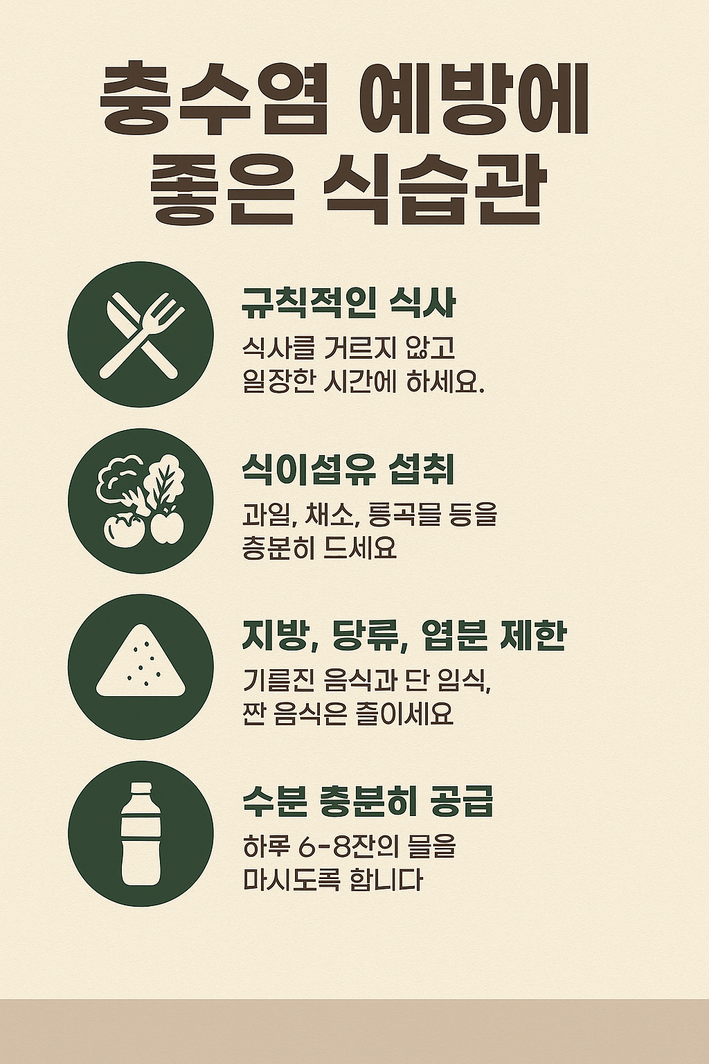 #맹장건강 #충수염예방 #식습관 #장건강 #식이섬유 #유산균 #발효식품 #물섭취 #과식예방 #소화건강 #장내환경 #면역력 #생활습관개선 #건강관리 #재발예방 #건강팁 #식단관리 #자기돌봄 #올바른습관 #건강한생활