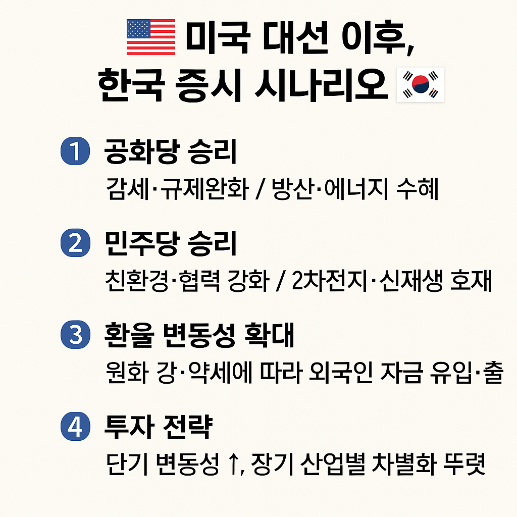 미국 대선은 단순히 미국 정치 이벤트가 아니라, 전 세계 투자자들의 자금 흐름을 바꾸는 거대한 변수입니다. 한국 증시 역시 그 영향권에서 자유로울 수 없습니다.