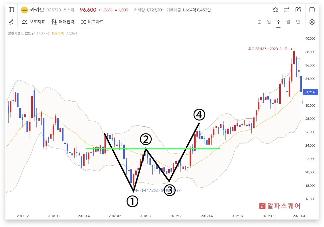- 중심선: 이동평균선 (보통 20일)