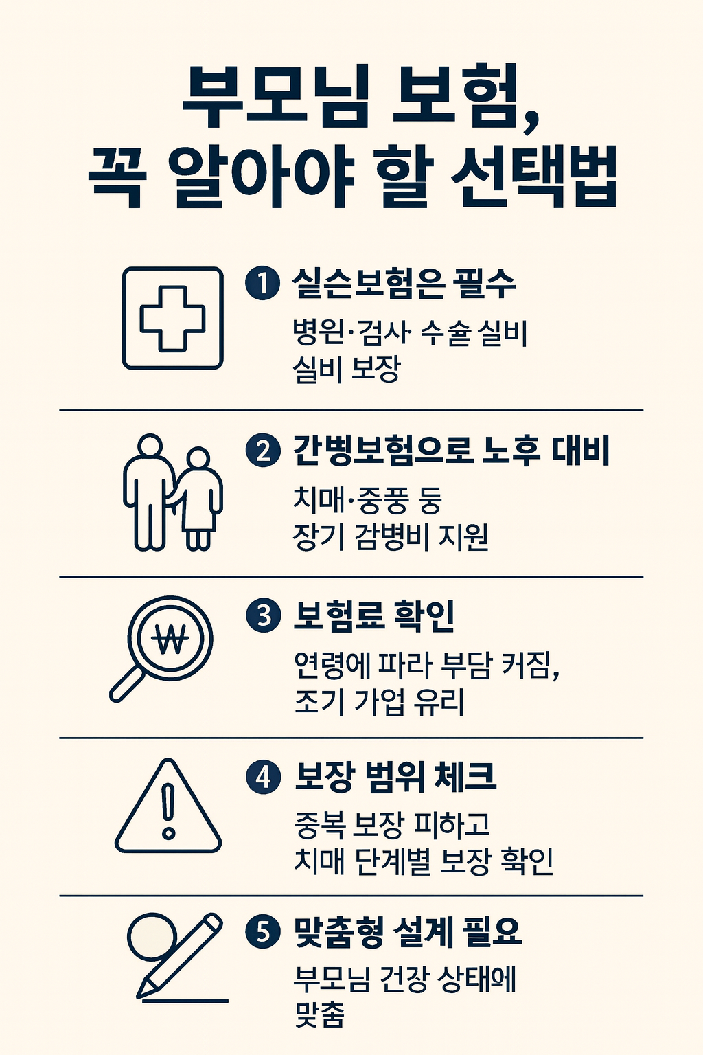 👉 부모님의 연령, 건강 상태, 현재 보유 중인 보험을 꼼꼼히 확인한 후, 전문가 상담을 통해 맞춤형으로 설계하는 것이 가장 바람직합니다.