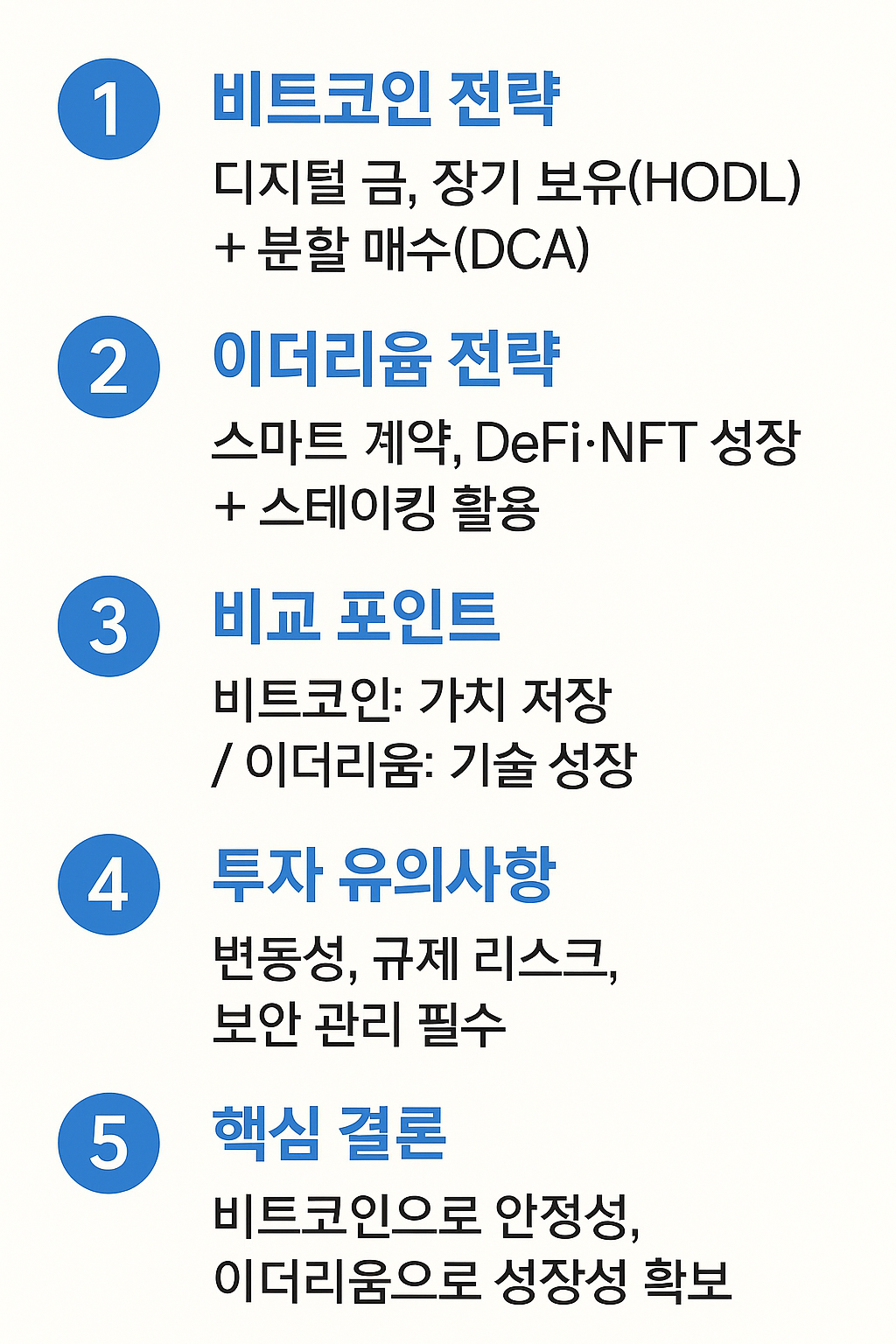👉 따라서, 투자자는 비트코인으로 안정적인 장기 가치 보존을, 이더리움으로 성장성 있는 자산 확장을 노리는 조합 전략을 고려할 수 있습니다.
