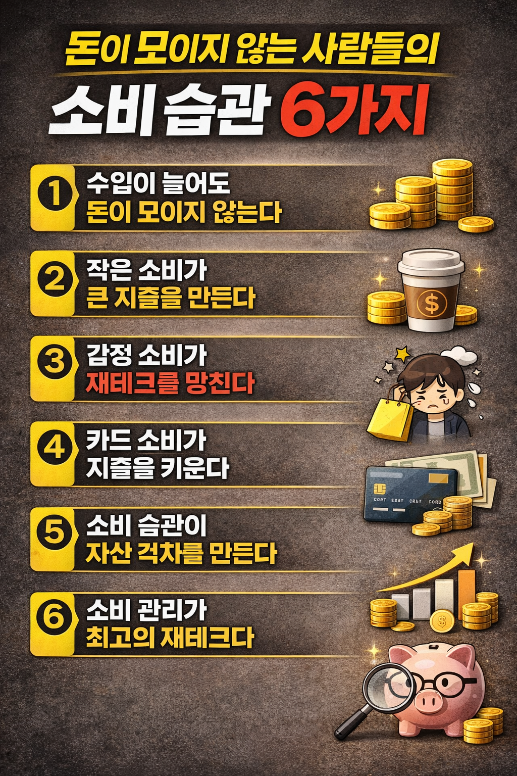 재테크를 어렵게 만드는 가장 큰 원인은 수입 부족이 아니라 잘못된 소비 패턴입니다. 소비 습관이 바뀌지 않으면 아무리 수입이 늘어나도 돈은 쉽게 모이지 않습니다. 하지만 소비 구조를 바꾸면 상황은 완전히 달라집니다.
