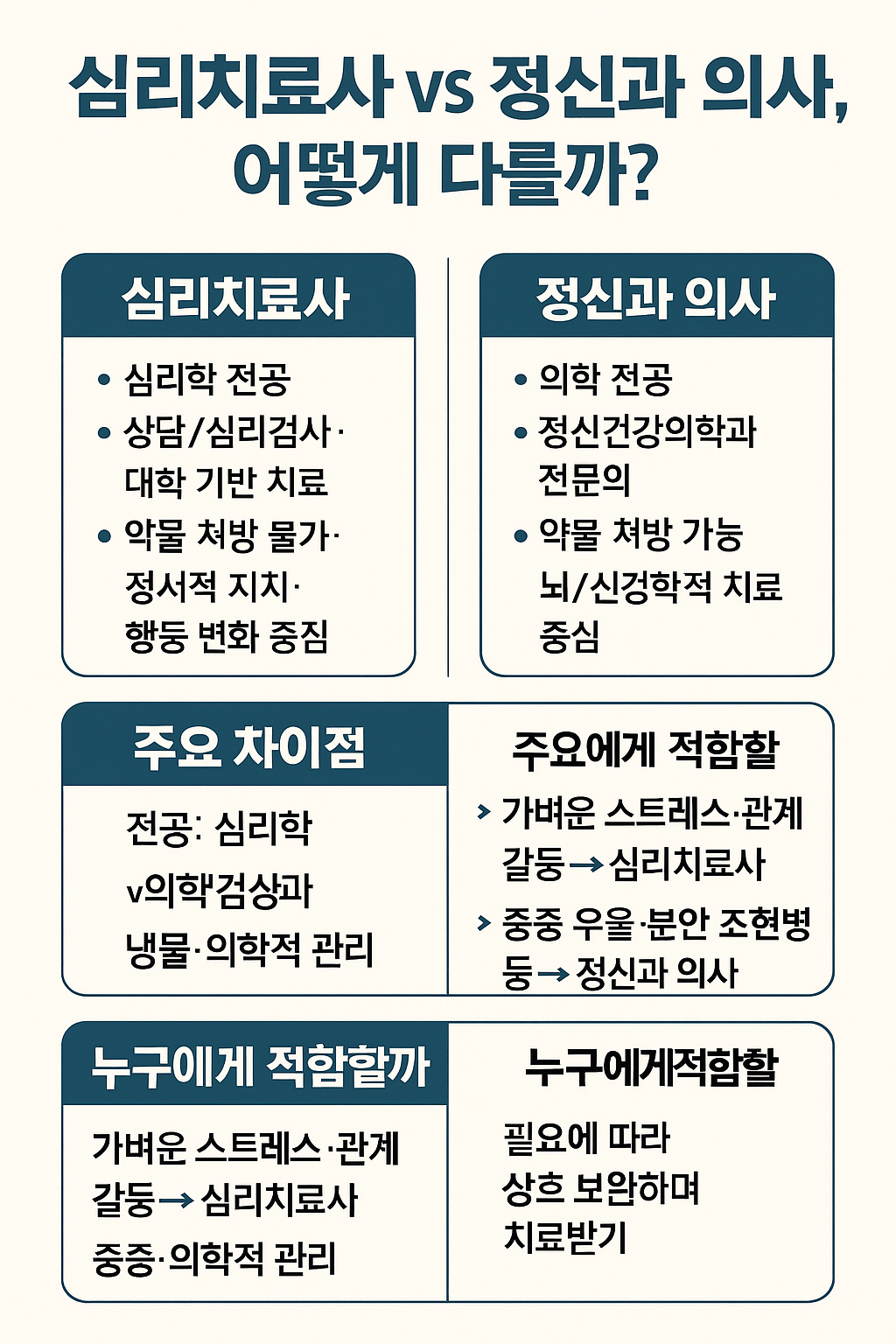 요즘은 마음 건강에 대한 관심이 높아지면서 심리상담이나 정신과 진료를 찾는 사람들이 많아졌습니다. 그런데 막상 도움을 받으려고 하면 “심리치료사와 정신과 의사는 뭐가 다를까?”라는 고민이 생기곤 합니다. 두 직업 모두 마음 문제를 다루지만, 전문 분야와 역할, 치료 방법에서 차이가 있습니다. 오늘은 이 두 전문가의 차이를 알기 쉽게 정리해 드리겠습니다.