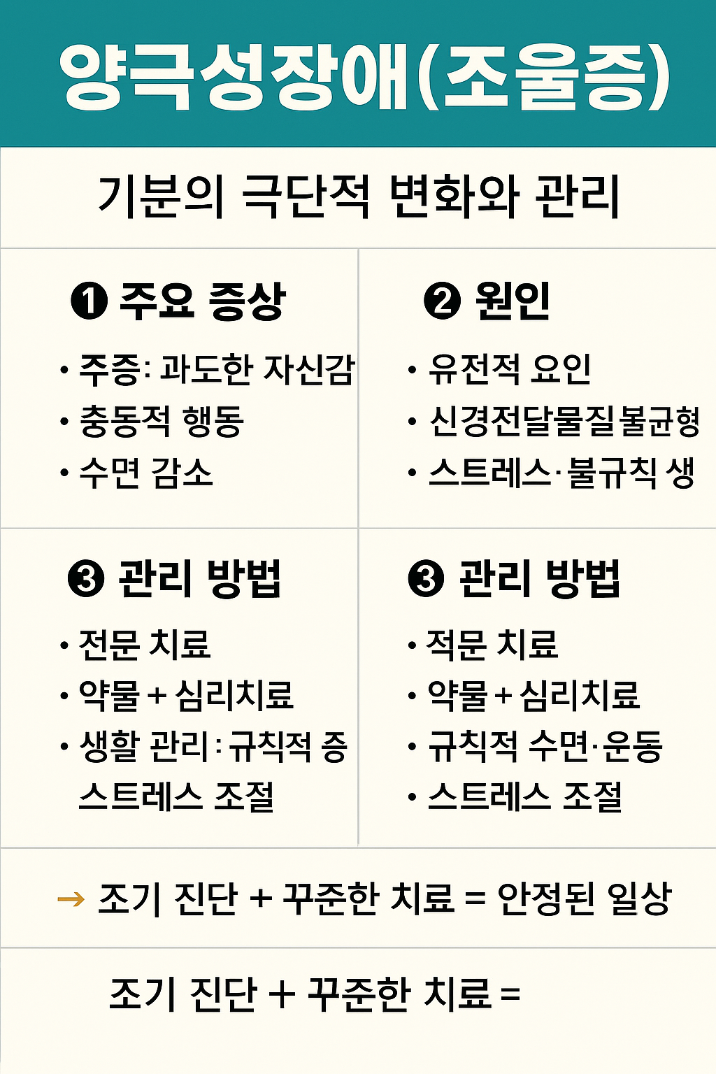 양극성장애는 단순한 기분 변화가 아니라, 치료와 꾸준한 관리가 필요한 만성 질환입니다.