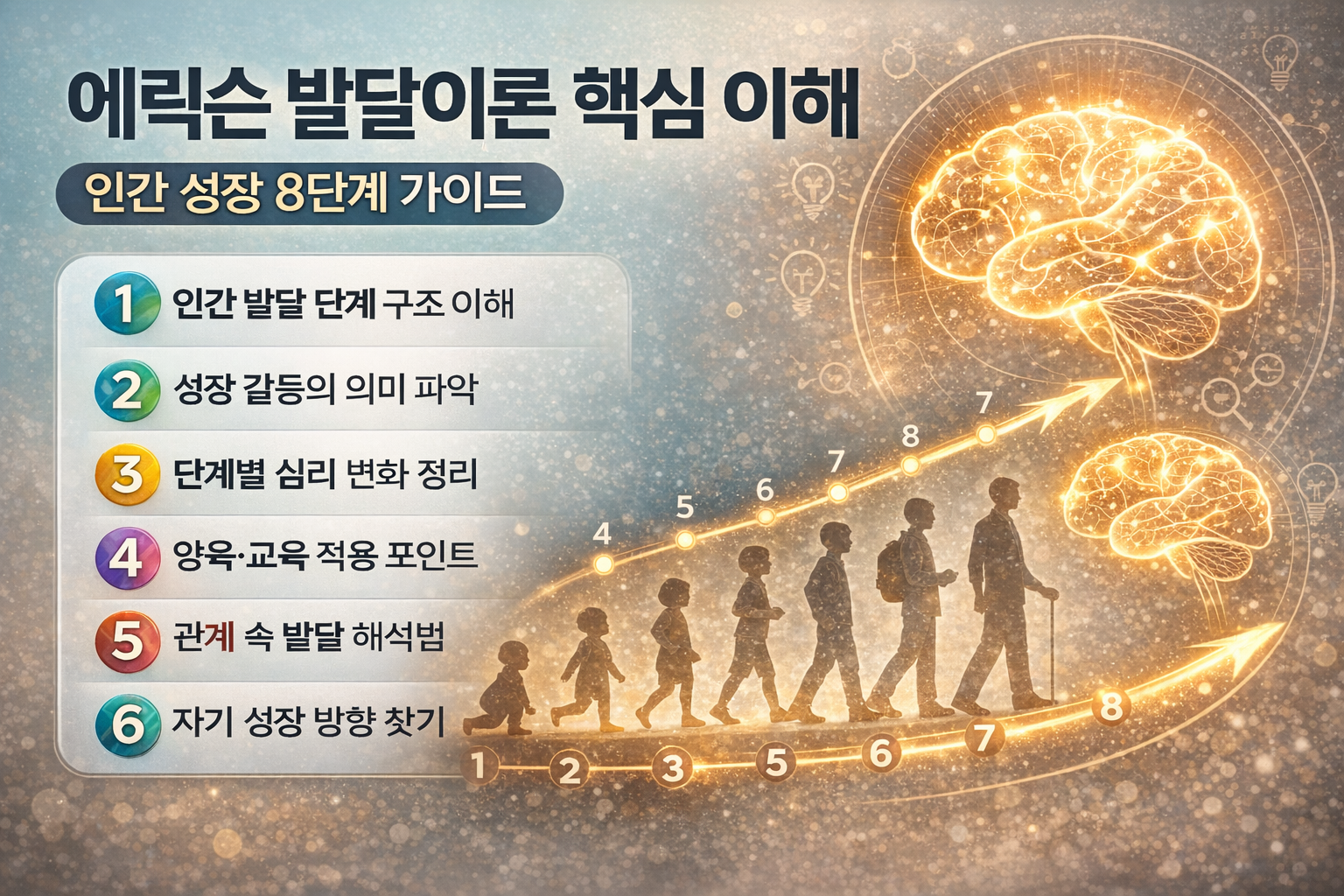 이 이론은 인간의 삶을 8단계로 나누고, 각 단계마다 반드시 마주하는 심리적 과제를 제시합니다. 이를 이해하면 자신과 타인의 행동을 더 깊이 바라볼 수 있고, 양육·교육·자기 성장·인간관계에서도 실제로 활용할 수 있습니다. 이 글에서는 에릭슨 이론을 쉽게 풀어 설명하고, 현실 적용 방법까지 단계별 + 확장 구조로 정리합니다.