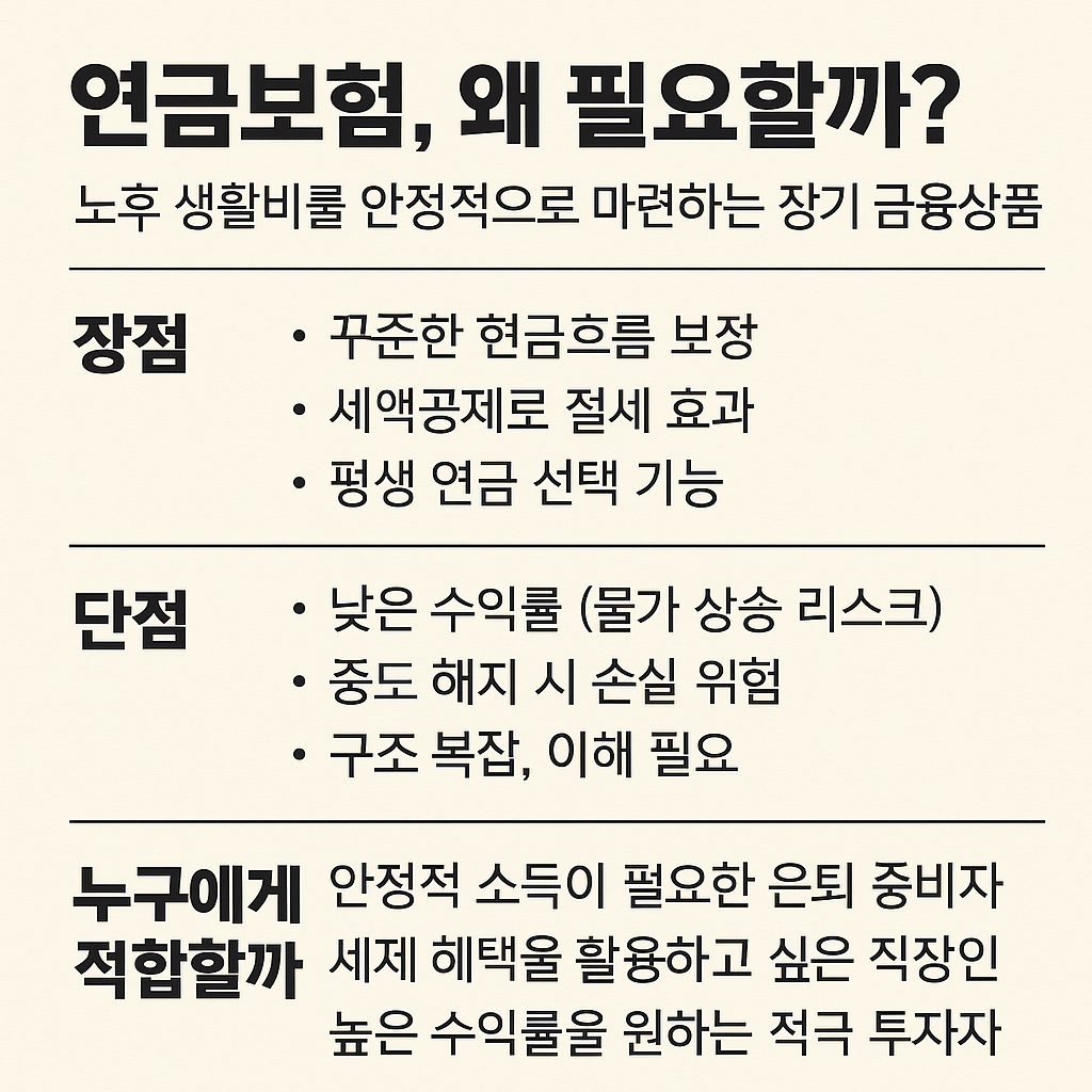 연금보험이 모든 사람에게 필수적인 것은 아닙니다. 하지만 꾸준히 안정적인 현금흐름을 원하는 사람이라면 충분히 고려할 만한 상품입니다.