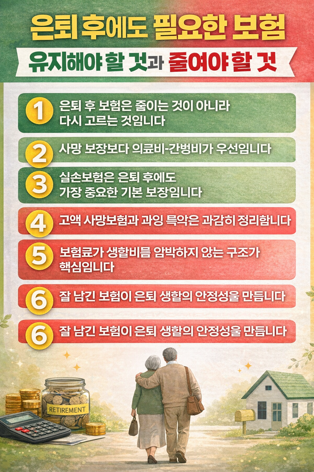 은퇴 후 보험의 핵심은 “많이 가입했느냐”가 아니라 “잘 맞게 남겨두었느냐” 입니다.
