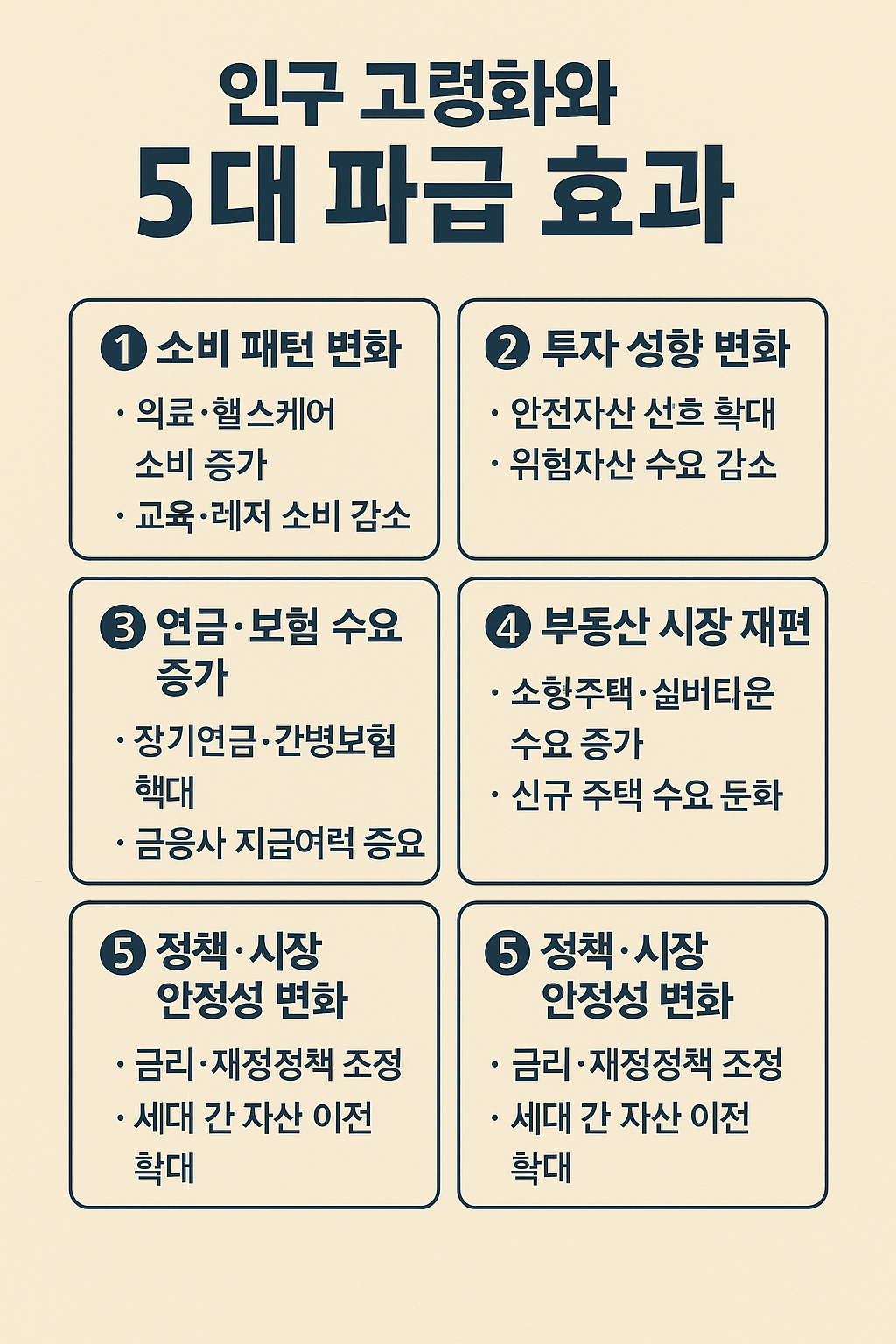 인구 고령화는 단순히 사회적 현상을 넘어 금융시장 전반에 큰 파급 효과를 미칩니다. 소비 패턴 변화, 자산 선호도 변화, 금융상품 수요 확대, 부동산 시장 재편, 정부 정책 변화 등 다양한 경로를 통해 시장이 구조적으로 바뀌게 됩니다.