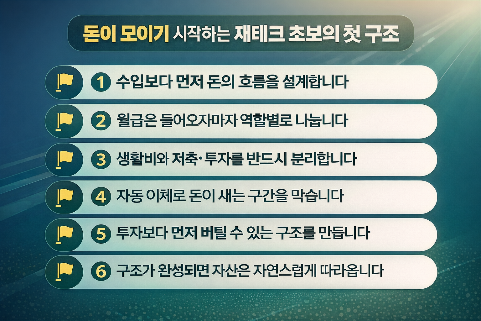 이 순서가 자동으로 굴러가야 재테크가 지속됩니다. 재테크는 결심이 아니라 시스템입니다.
