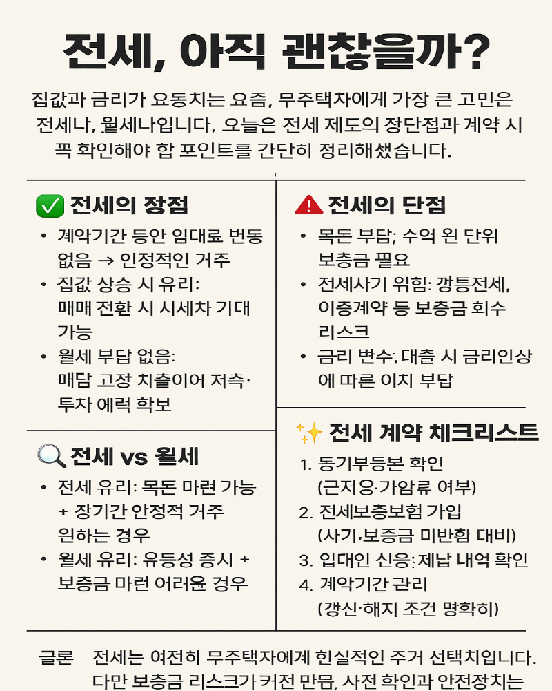 집값과 금리가 요동치는 요즘, 무주택자에게 가장 큰 고민은 전세냐, 월세냐입니다. 오늘은 전세 제도의 장단점과 계약시 꼭 확인해야 할 포인트를 간단히 정리했습니다.