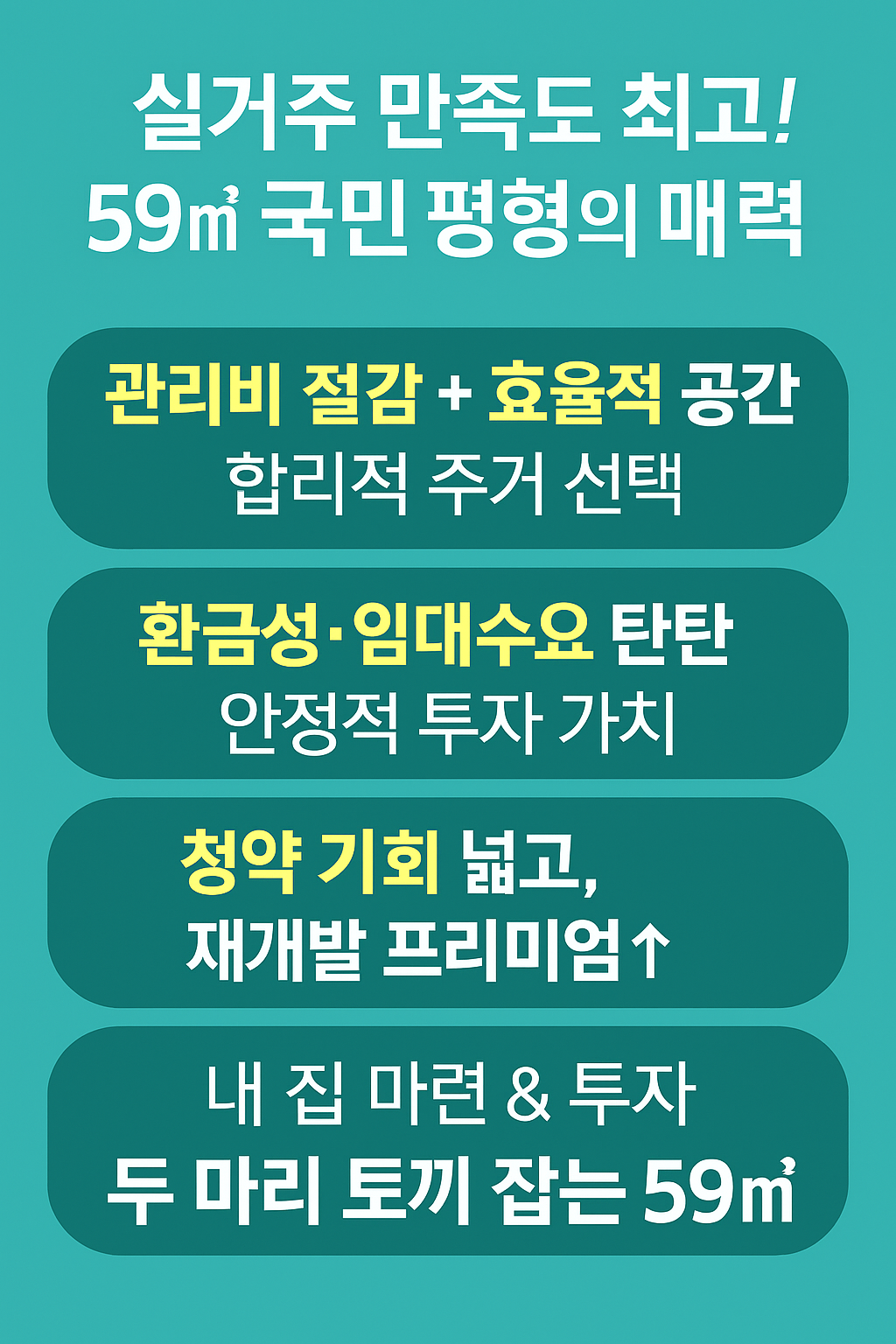 👉 내 집 마련을 준비하는 실수요자든, 안정적인 투자처를 찾는 투자자든, 전용 59㎡ 아파트를 한 번쯤은 눈여겨볼 필요가 있습니다.