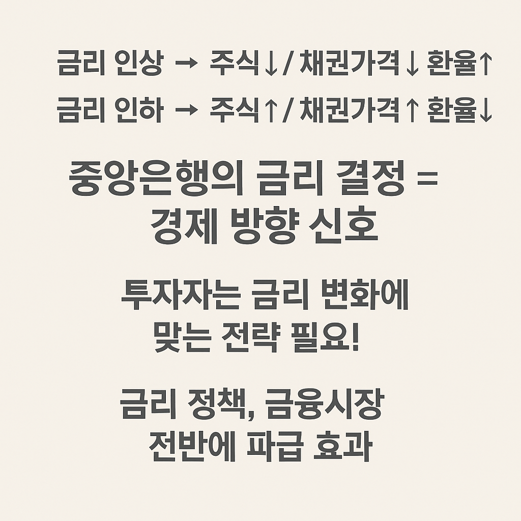 중앙은행의 금리 결정은 금융시장의 방향을 결정짓는 핵심 변수입니다. 주식, 채권, 외환, 부동산 등 모든 자산시장에 연쇄적으로 영향을 미치며, 가계와 기업 활동에도 직접적인 영향을 줍니다. 따라서 금리 정책을 이해하고 대응 전략을 세우는 것이야말로 불확실한 금융시장에서 성공적인 투자를 위한 필수 조건입니다.