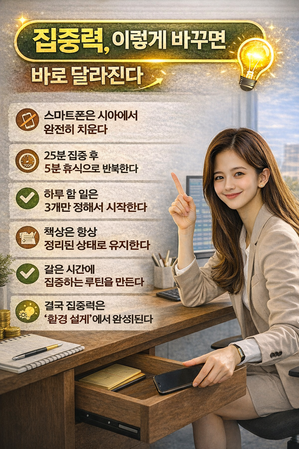 요즘 많은 사람들이 말합니다. “집중이 안 된다”, “앉아 있어도 일이 안 된다” 하지만 중요한 사실은 집중력은 타고나는 것이 아니라 ‘관리하는 능력’ 이라는 점입니다.