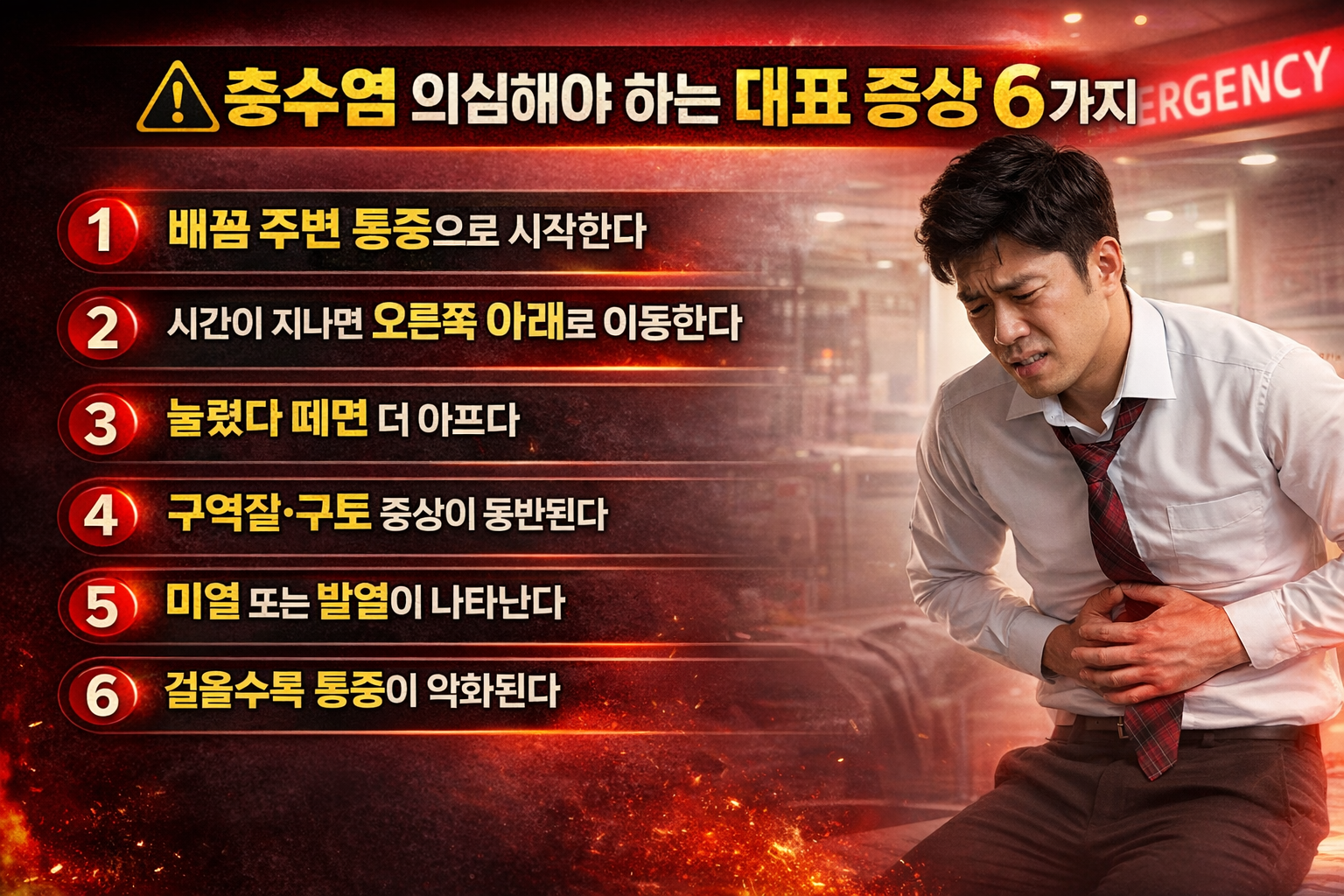 ▶ 충수염 의심 증상이 있다면 지체하지 말고 즉시 의료기관을 방문하는 것이 가장 현명한 선택입니다.