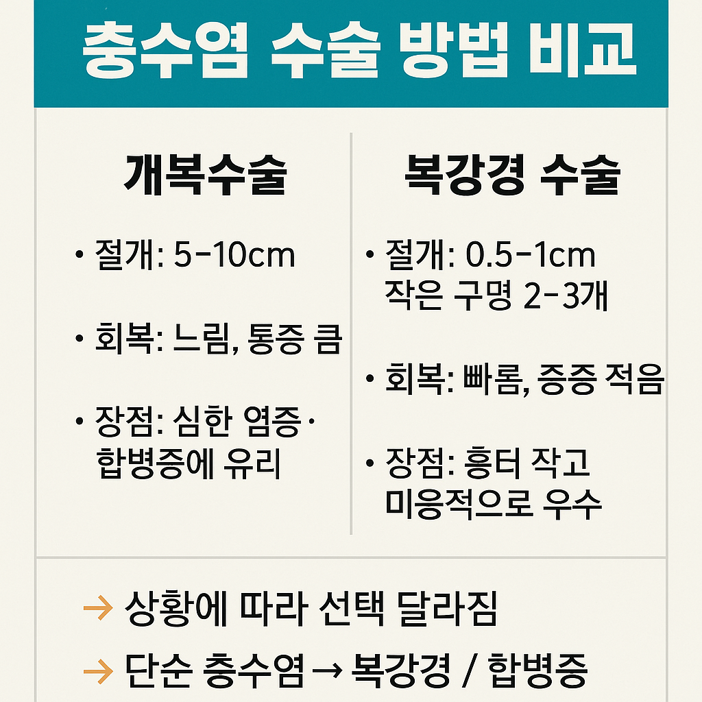 충수염 수술에는 두 가지 방법이 있지만, 최근에는 회복이 빠르고 흉터가 적은 복강경 수술이 더 많이 시행되고 있습니다. 다만 모든 경우에 해당되는 것은 아니므로, 최종적인 수술 방법은 의사의 판단과 환자의 상태에 따라 달라집니다.