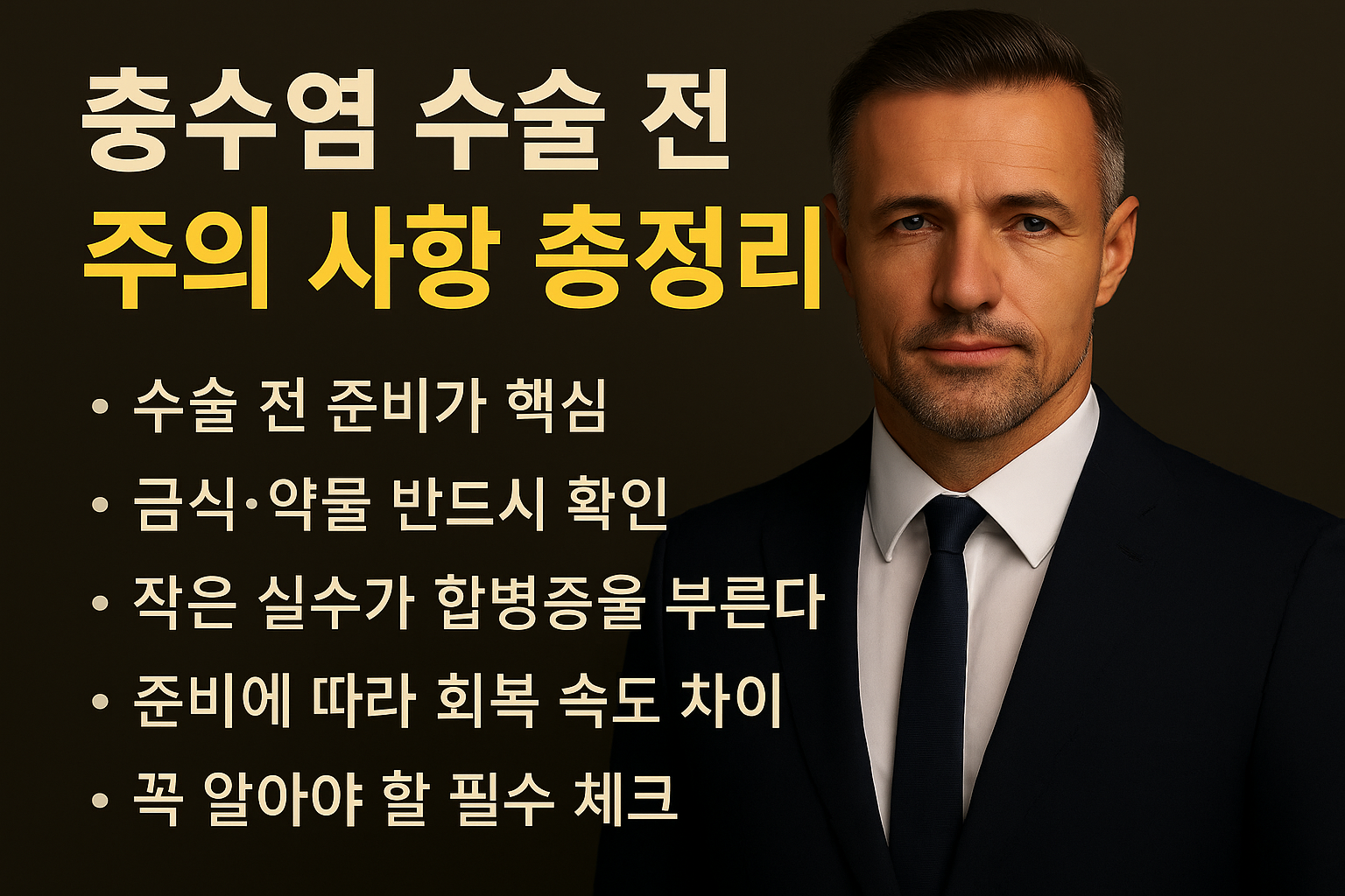 충수염(맹장염)은 비교적 흔한 질환이지만, 방치 시 생명을 위협할 수 있는 응급 상황으로 발전할 수 있습니다. 특히 충수가 터질 경우 복막염·패혈증 위험이 커지기 때문에, 적절한 시점의 수술과 수술 전 준비가 매우 중요합니다. 많은 분들이 “수술만 하면 끝”이라고 생각하지만, 실제로는 수술 전 관리가 예후를 좌우합니다. 이 글에서는 충수염 수술을 앞둔 환자와 보호자가 반드시 알아야 할 수술 전 주의 사항을 단계별로 총정리합니다.