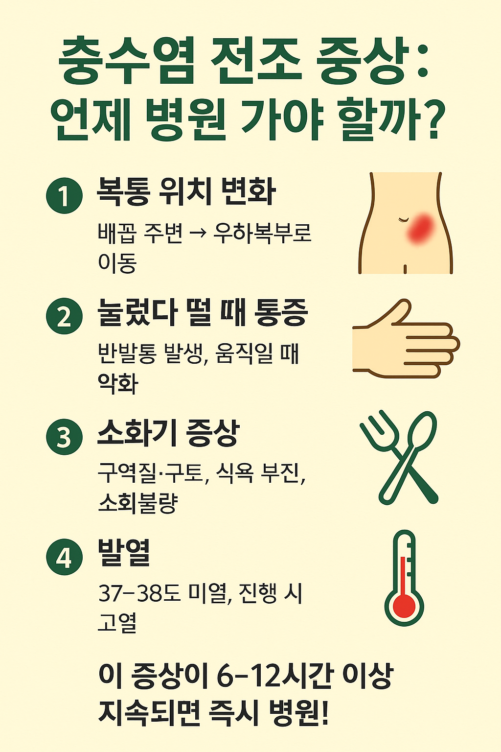 👉 복통 위치 변화 + 눌렀다 뗄 때 통증 + 소화기 증상 + 미열이 있다면, 망설이지 말고 병원을 찾으세요.