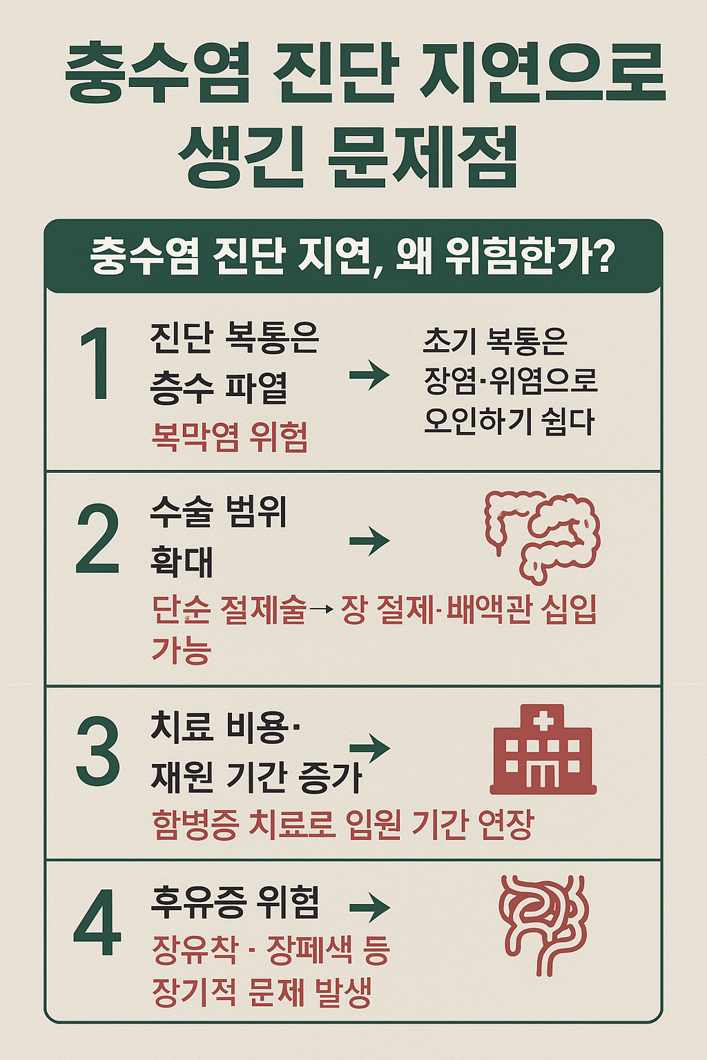진단이 늦어질수록 입원 기간이 늘어나고, 항생제 치료·추가 수술·집중 치료가 필요해 의료비 부담이 커집니다.