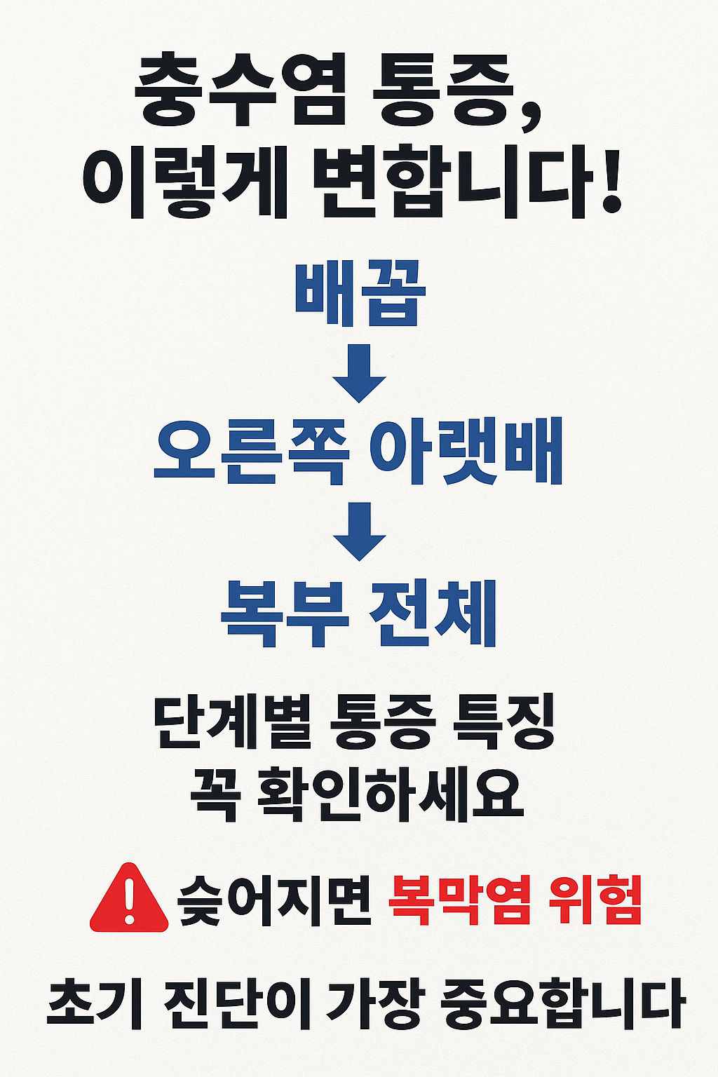 충수염의 가장 중요한 특징은 시간이 지나면서 통증이 이동한다는 점입니다. 초기에는 배꼽 주변이 아프다가, 약 12~24시간이 지나면 **오른쪽 아랫배(우하복부)**로 통증이 옮겨갑니다.