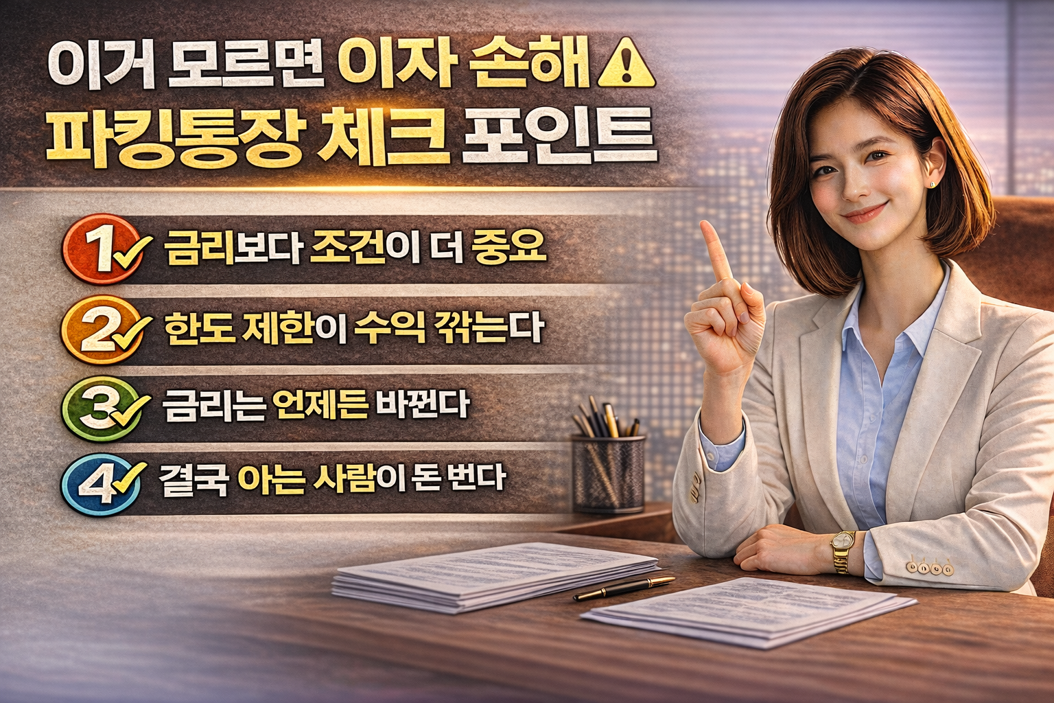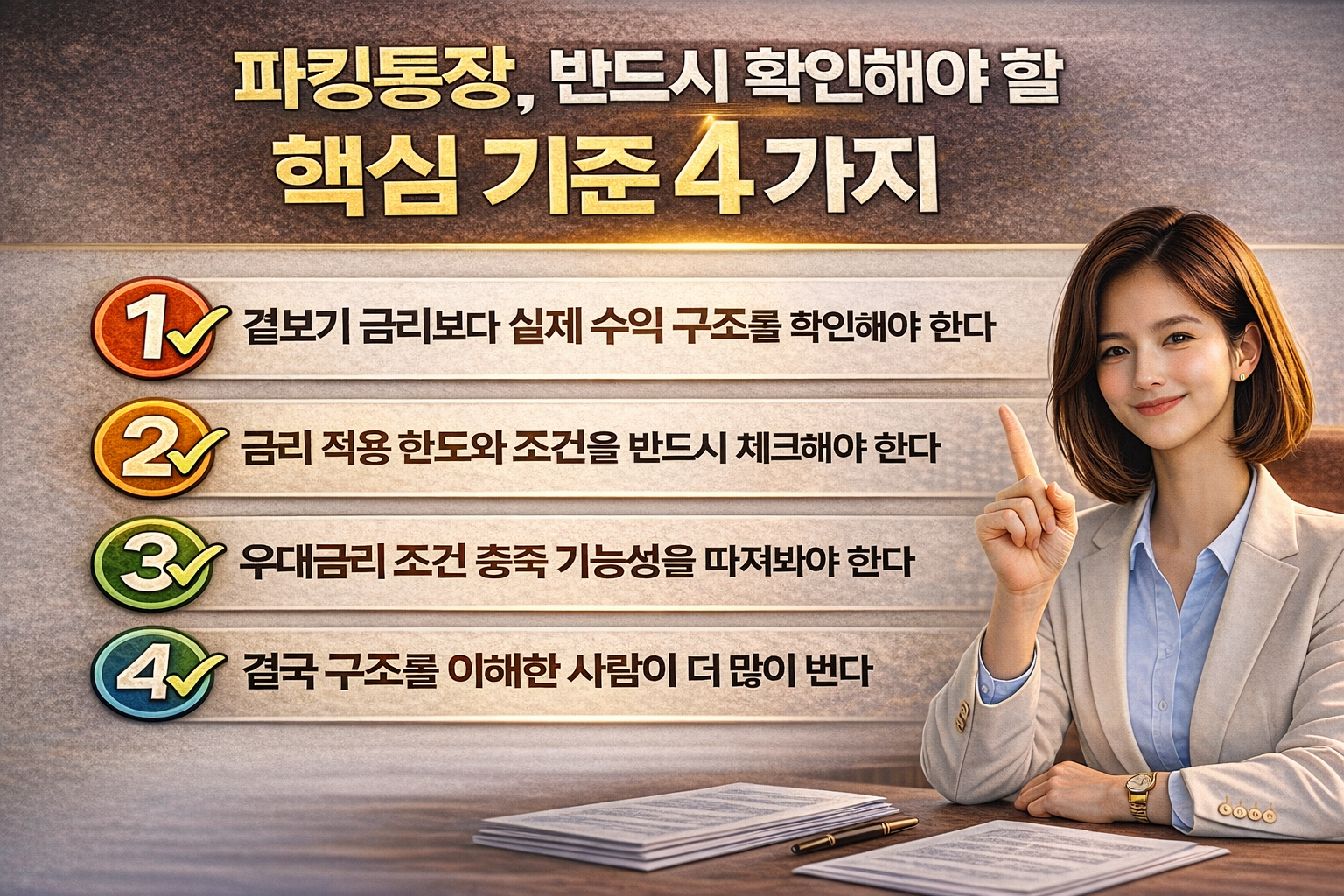 파킹통장을 선택할 때 대부분 사람들은 “금리 몇 퍼센트인가?”만 봅니다. 하지만 이 기준만으로 선택하면 실제 수익은 줄어들고, 오히려 손해를 볼 수 있습니다.