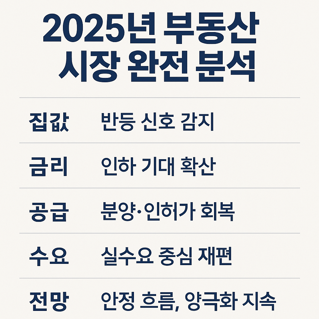 결국 2025년 부동산 시장은 **“하락세를 지나 회복 초입으로 이동 중”**이라고 볼 수 있습니다. 금리 완화, 공급 재편, 정책 변화라는 세 가지 축이 모두 맞물리는 전환기적 시장입니다.