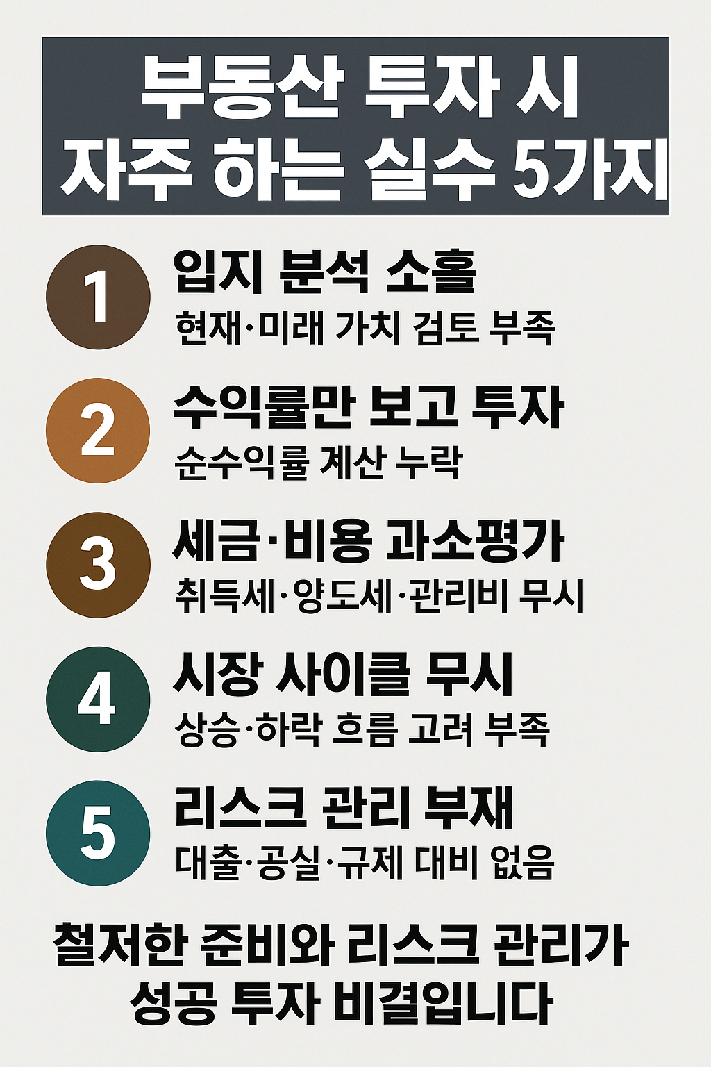 부동산 투자는 제대로만 하면 안정적인 자산 증식 수단이 될 수 있습니다. 하지만 입지 분석 소홀, 수익률 착시, 세금 무시, 시장 사이클 무시, 리스크 관리 부재 같은 기본적인 실수는 반드시 피해야 합니다.
