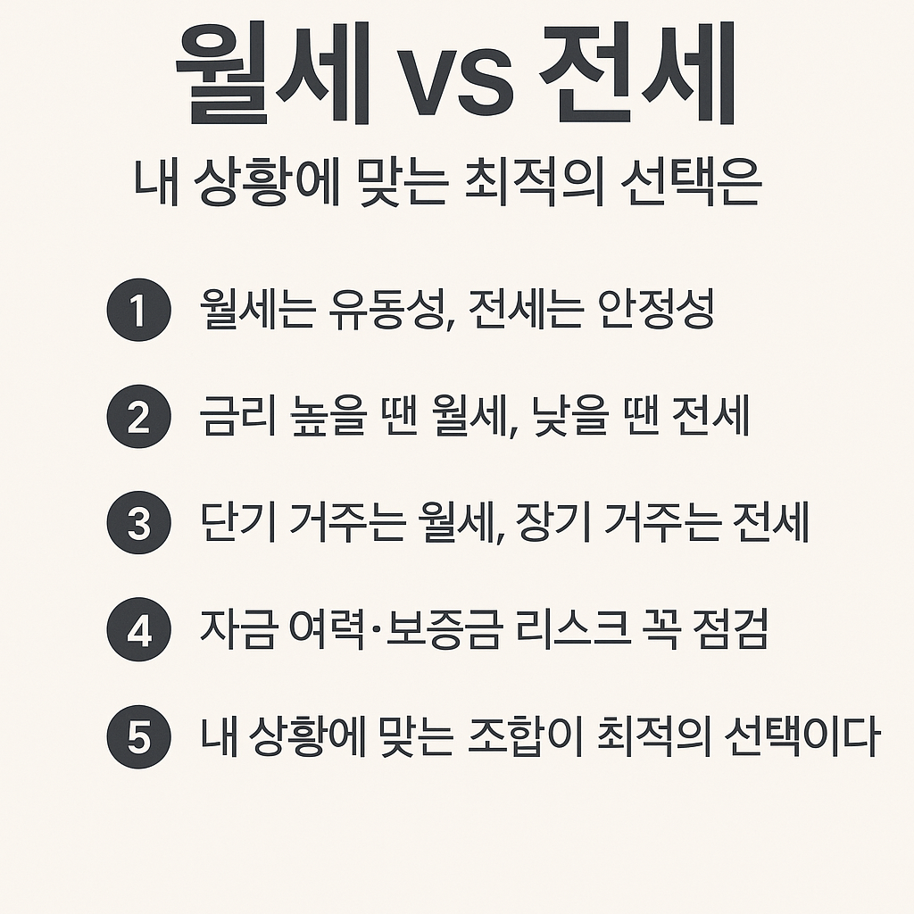 👉 즉, 세금 측면에서 보면 월세가 단기적으로 유리, 자금 효율 측면에서는 전세가 장기적으로 유리합니다.