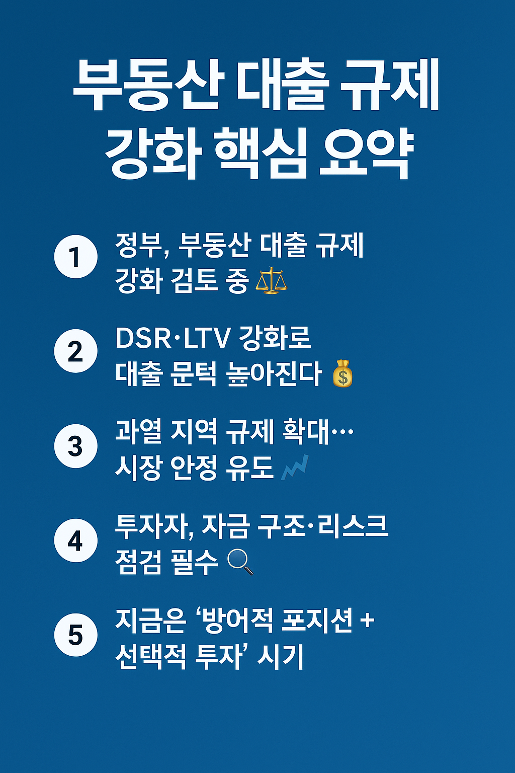 📌 정부의 규제 강화는 시장을 일시적으로 식힐 수 있지만, 공급 구조적 한계와 수도권 중심 수요는 여전히 유효합니다.