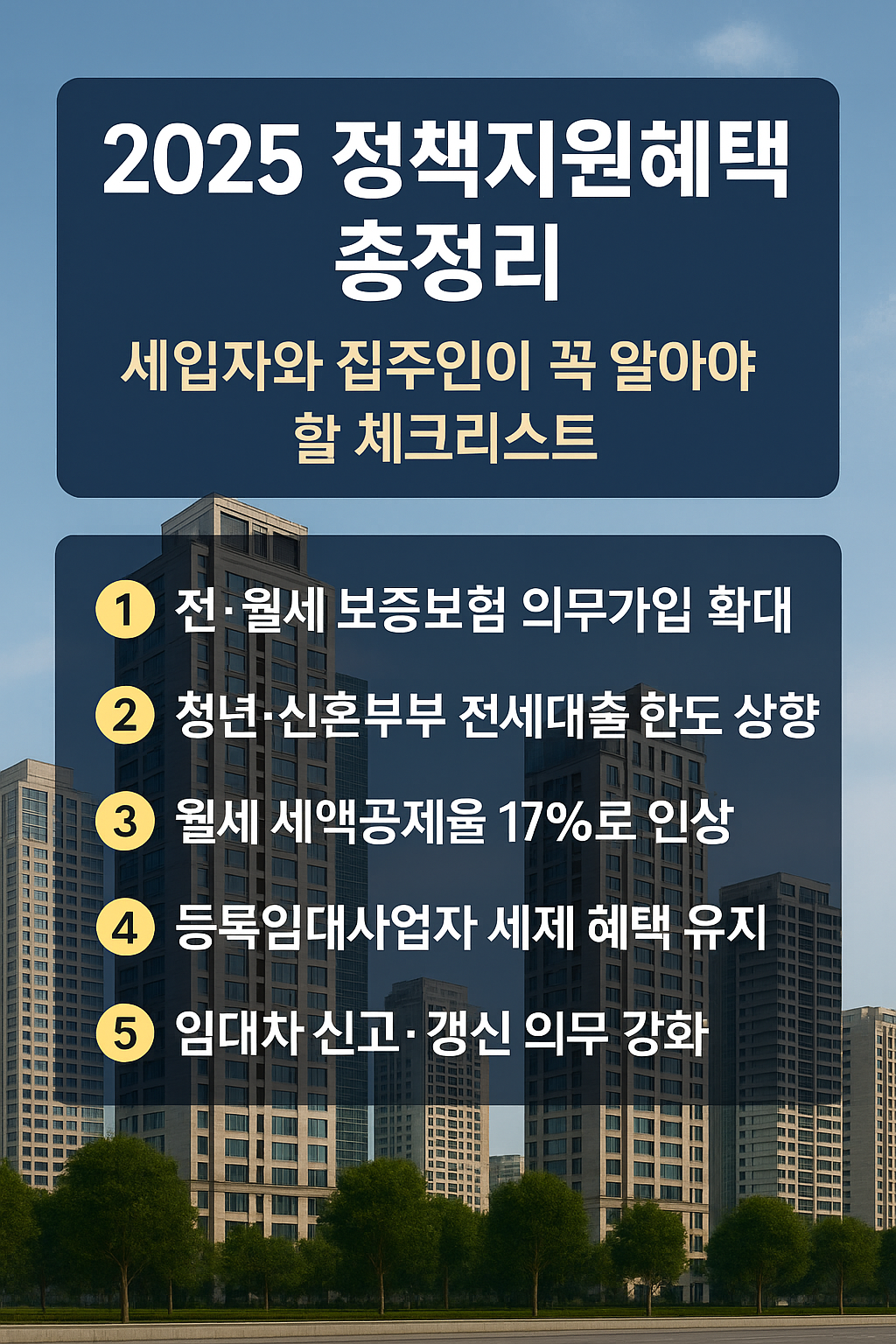 2025년 부동산 시장은 단순한 매매 중심이 아니라 **정책 기반의 ‘관리형 시대’**로 진입했습니다. 세입자는 정부의 보증·대출·세액공제 혜택을 최대한 활용하고, 집주인은 제도와 세금 구조를 이해해 합법적이고 안정적인 임대수익 구조를 만들어야 합니다. 정책은 복잡하지만, 제대로 알면 돈을 지키고 불리는 가장 확실한 방법입니다. 지금 바로 자신에게 해당되는 지원제도를 확인하고,