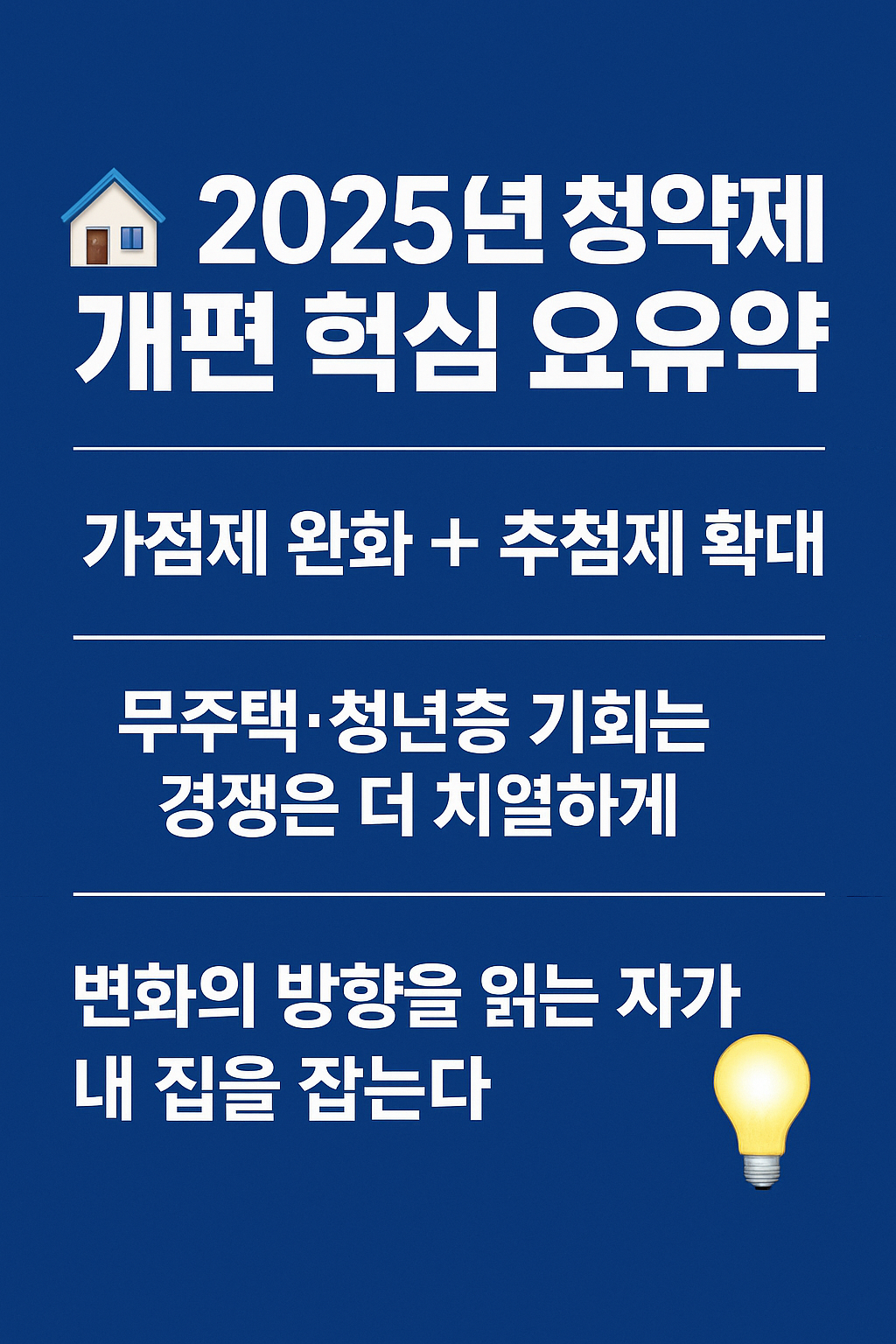 2025년 아파트 청약 가점제 개선안은 단순한 제도 변경이 아닙니다. 무주택자, 청년층, 신혼부부 등에게는 희망 요인일 수 있지만, 기존 가점자에게는 판도 변화가 될 수 있습니다.