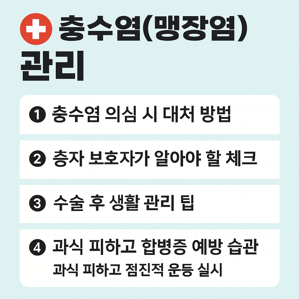 #충수염관리 #맹장염증상 #충수염응급대처 #맹장수술후관리 #복부통증대처 #응급질환 #수술후식사 #건강관리팁 #소화기질환예방 #맹장염관리