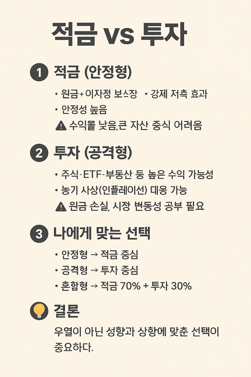 👉 투자는 성장 가능성과 장기적 자산 증식을 원하는 사람에게 적합합니다.
