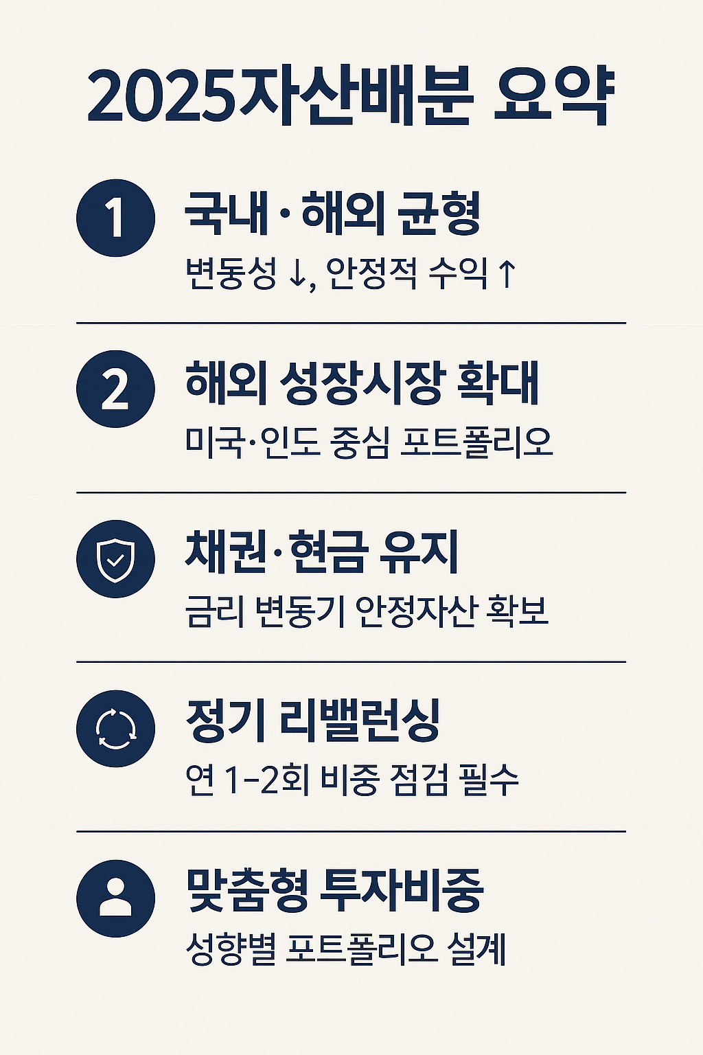 📊 따라서 2025년은 국내 안정형 + 해외 성장형 혼합 포트폴리오가 유효한 해로 평가됩니다.
