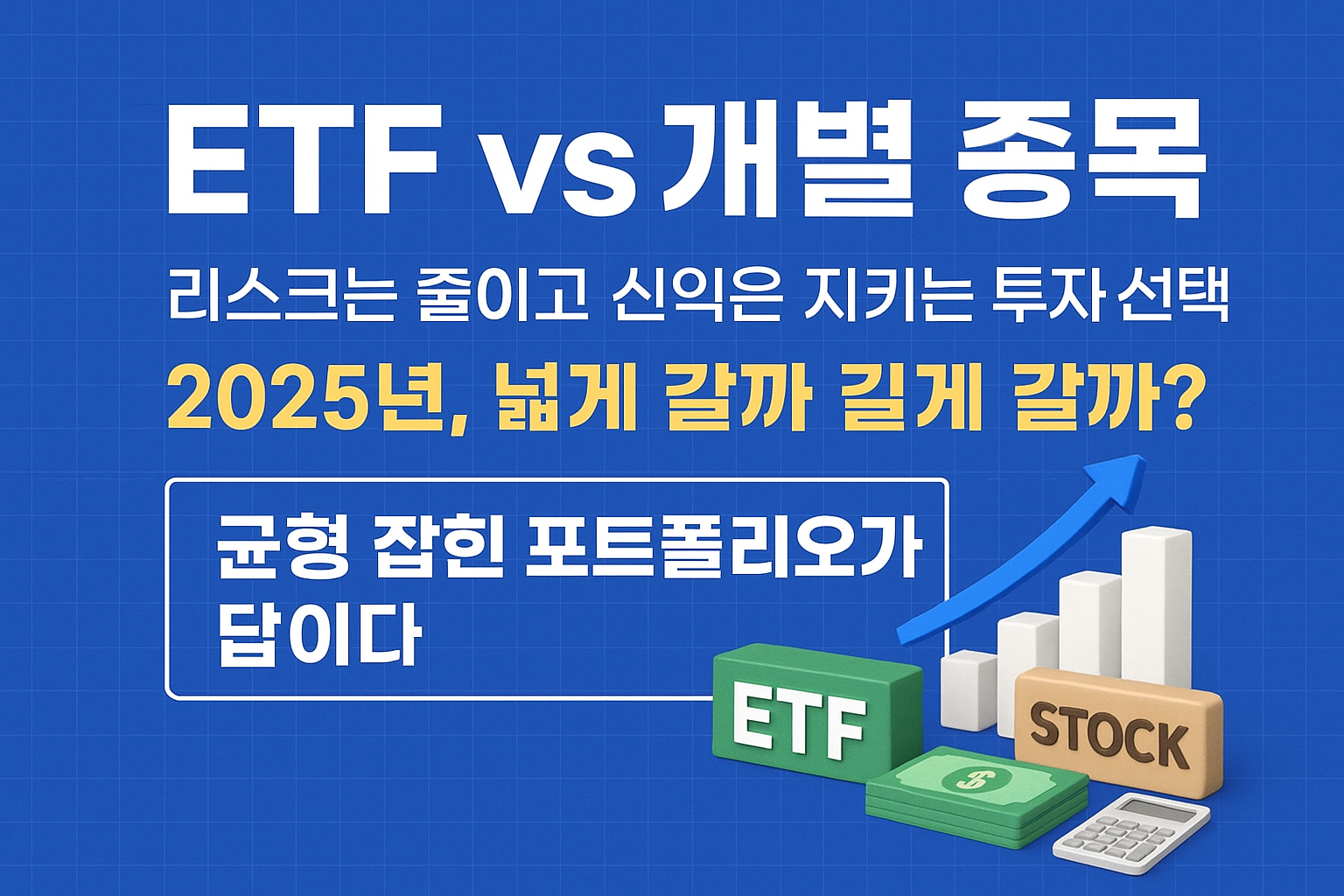 2025년, 투자 시장의 화두는 단연 **“선택과 집중”**입니다. 금리 인하 기대감이 커지고, 기술 혁신과 산업 트렌드가 빠르게 바뀌면서 투자자들은 “ETF로 넓게 갈까, 아니면 개별 종목으로 깊게 갈까?”라는 질문 앞에 서 있습니다. 이번 글에서는 **ETF(상장지수펀드)**와 개별 종목 투자의 장단점을 명확히 비교하고, 2025년 시장 환경에서 어떤 선택이 더 유리한지 구체적으로 살펴보겠습니다.