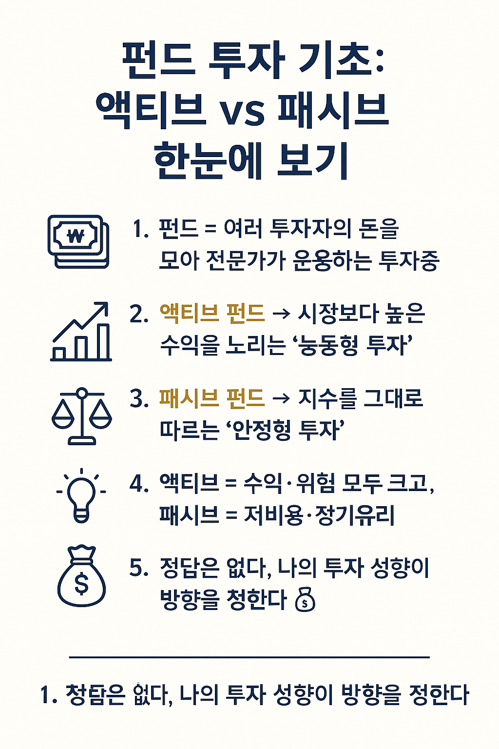 투자를 시작하는 사람이라면 한 번쯤 이런 고민을 해봤을 거예요. “펀드가 좋다는데, 도대체 어떤 펀드를 사야 할까?” 주식, 채권, ETF, 펀드… 용어도 많고, 다 비슷해 보여 헷갈리죠. 그중에서도 **펀드의 ‘운용 방식’**은 매우 중요합니다. 오늘은 펀드 투자의 기본 개념부터 액티브 vs 패시브 펀드의 차이, 그리고 어떤 상황에서 무엇을 선택하면 좋은지까지 자세히 알아볼게요.