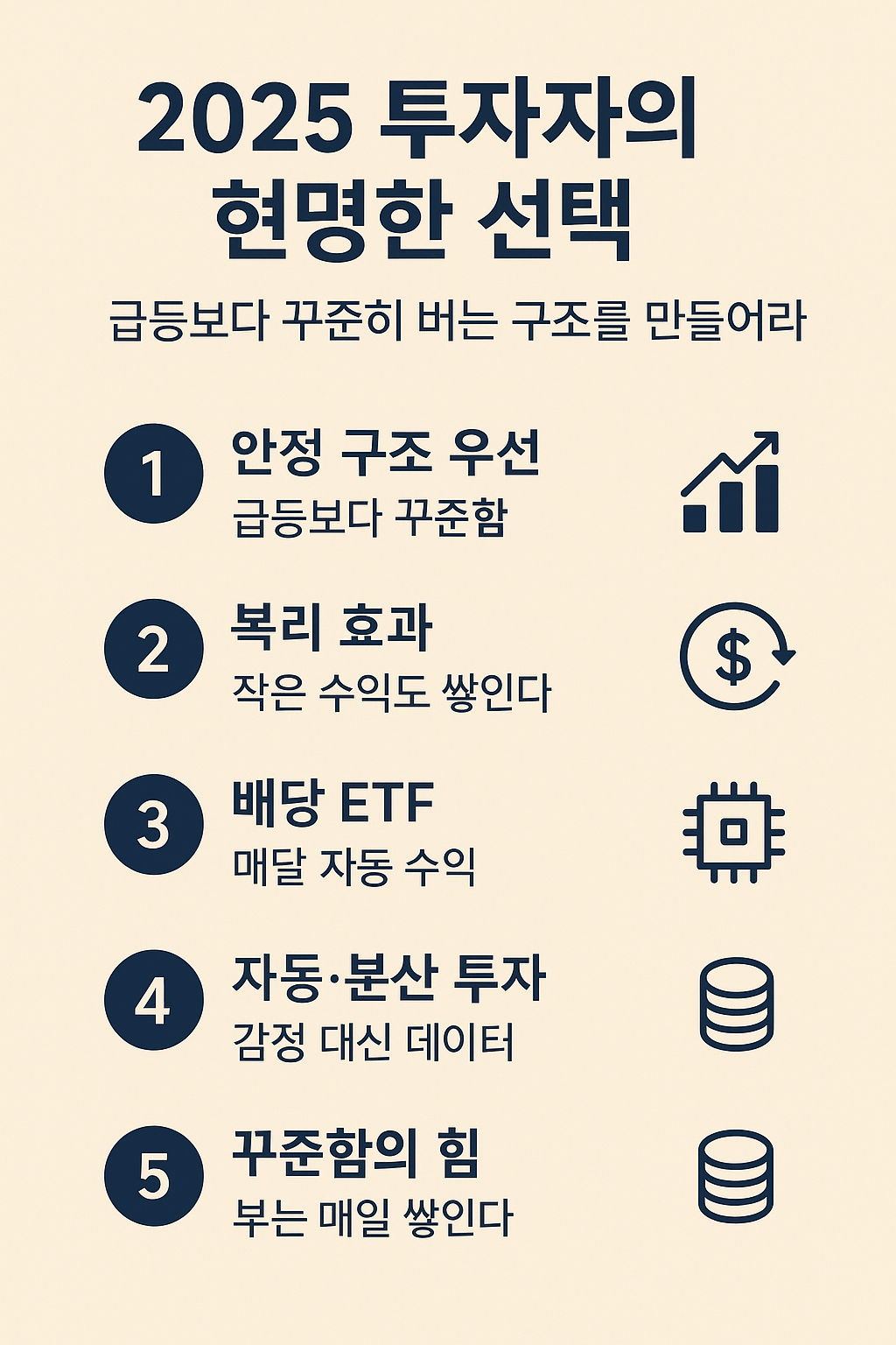 2025년 이후의 시장은 지속 가능한 습관 을 가진 투자자에게 유리합니다. 이 구조가 바로 ‘재테크의 내구성’을 결정합니다.