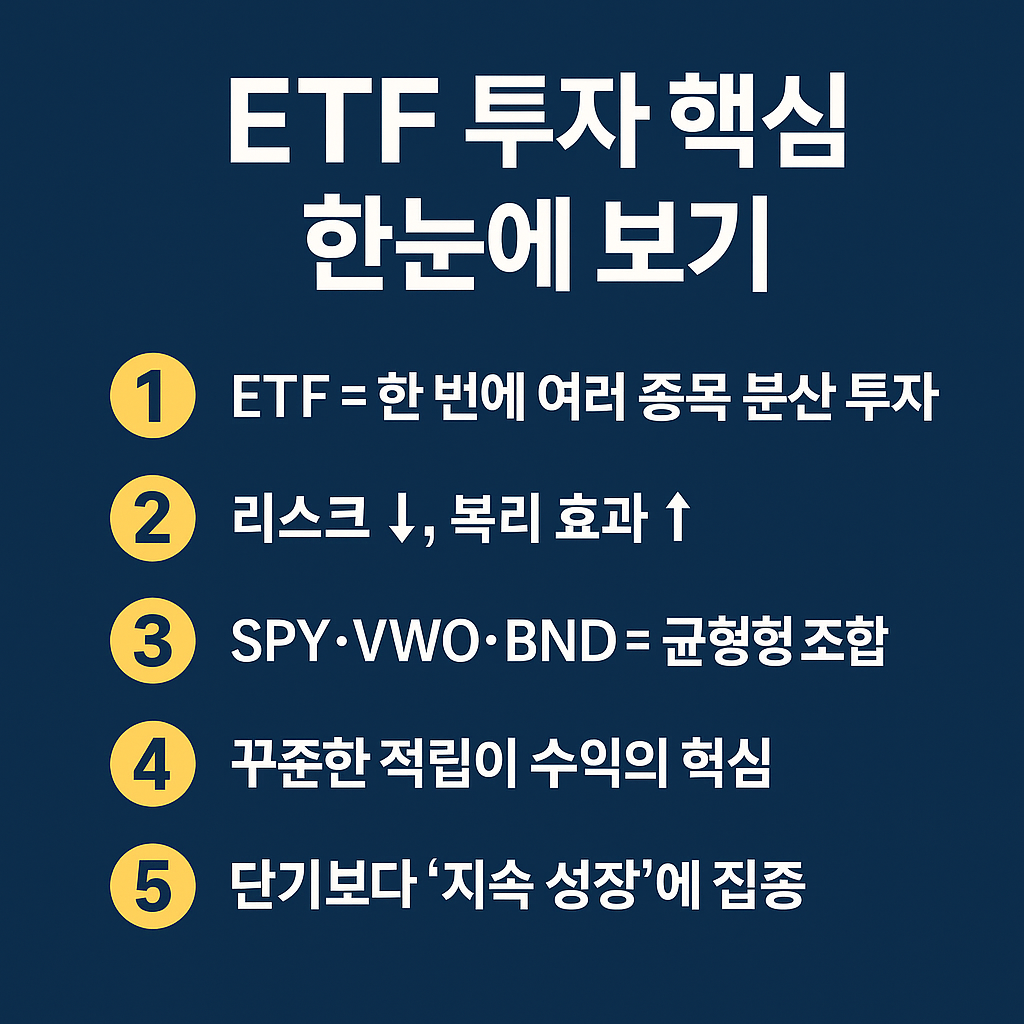 이렇게 ETF를 활용하면 한 번의 투자로 자동 분산 효과를 누릴 수 있습니다. 결국 핵심은 “리스크 분산 + 꾸준한 적립” 입니다.