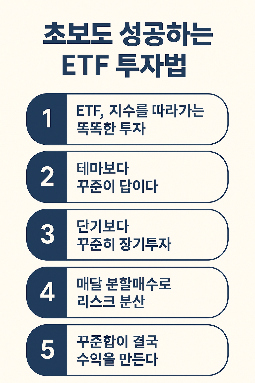 ETF 투자는 ‘빠른 돈’을 버는 게임이 아닙니다. 오히려 시장 전체의 성장에 꾸준히 참여하고, 장기적으로 복리의 힘을 누리는 과정입니다. ETF의 구조를 이해하고, 테마보다 기본 지수에 투자하며, 정기적 분할 매수 원칙만 지킨다면 누구나 **‘ETF 투자로 꾸준히 수익을 내는 투자자’**가 될 수 있습니다.