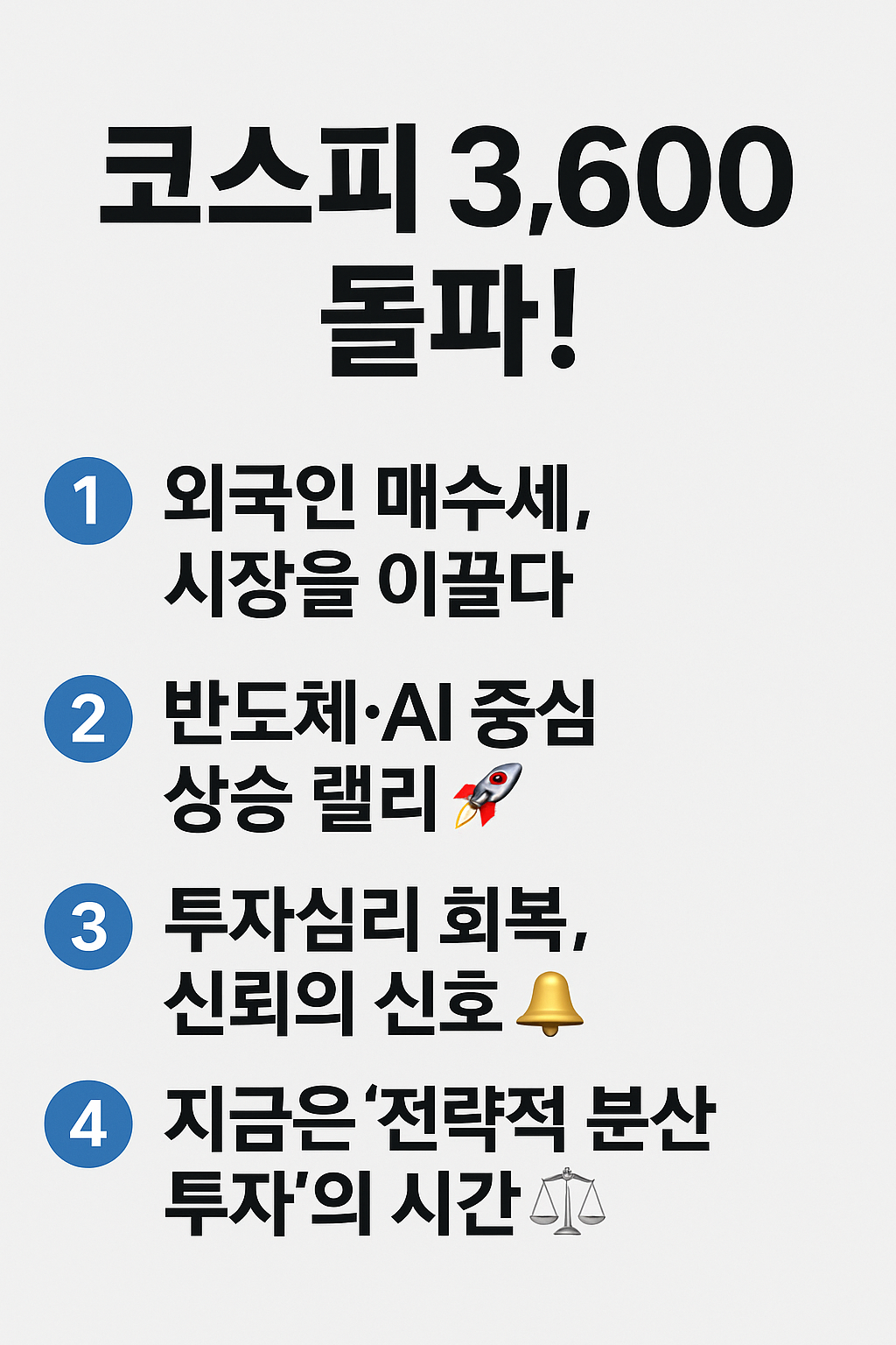이번 글에서는 코스피 3,600 돌파의 배경과, 외국인 자금 유입이 의미하는 바, 그리고 앞으로의 투자 전략 포인트를 정리해보겠습니다.