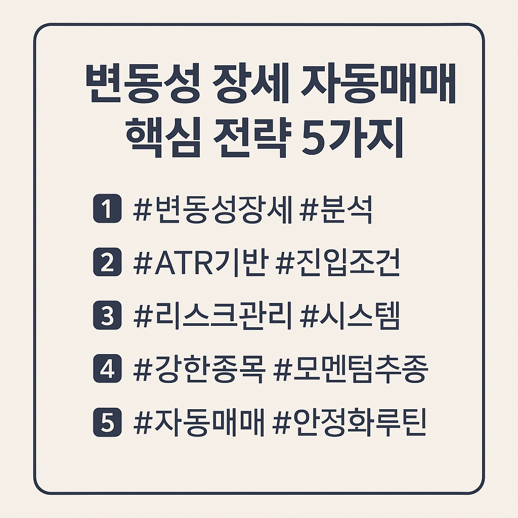 자동매매가 높은 성과를 내기 위해서는 변동성 기반 전략, 시장 필터, 리스크 관리, 백테스트, 운영 루틴 이 모두 조화롭게 구성되어야 한다. 이 5가지 요소가 갖춰질 때, 변동성 장세는 오히려 수익 기회가 가장 많은 시장이 된다.