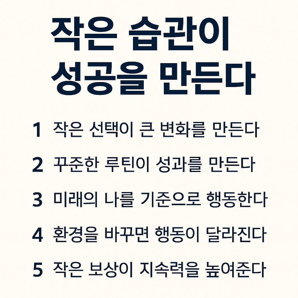 이 다섯 가지가 동시에 갖춰질 때, 삶의 방향은 완전히 달라진다. 작은 습관이 인생을 바꾸는 이유는 그 변화가 ‘오늘’이 아니라 ‘계속되는 내일’을 만들기 때문이다.