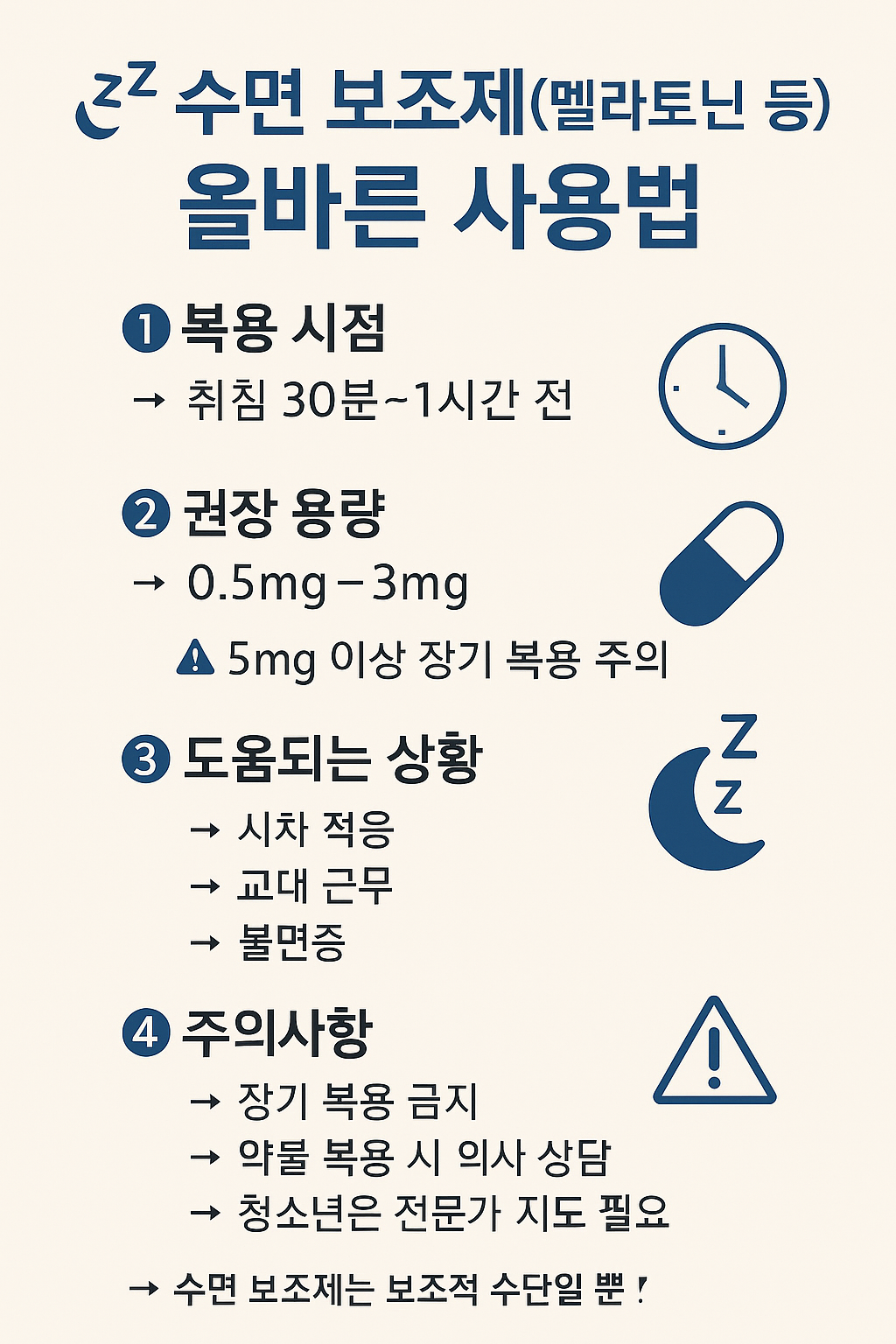 수면 보조제는 어디까지나 **“보조적인 역할”**일 뿐입니다.