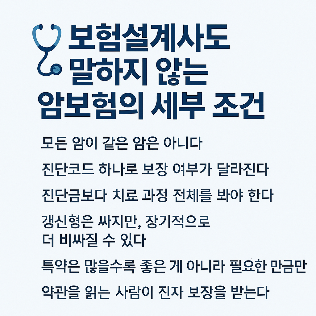 암보험은 단순히 “들면 든다”의 상품이 아닙니다. 약관 한 줄, 진단 코드 하나, 특약 선택 하나로 받을 수 있는 보장금이 달라지는 구조입니다.