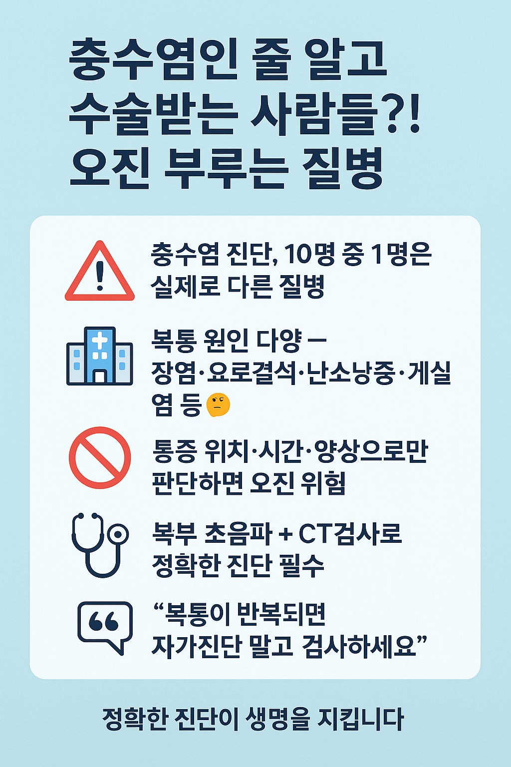 #충수염 #맹장염 #복통원인 #오진사례 #수술오진 #게실염 #난소낭종 #요로결석 #장염 #크론병 #건강정보 #생활의학 #복부통증 #티스토리건강블로그 #질병구분 #소화기질환 #응급실사례 #내과정보 #복통원인찾기 #건강관리