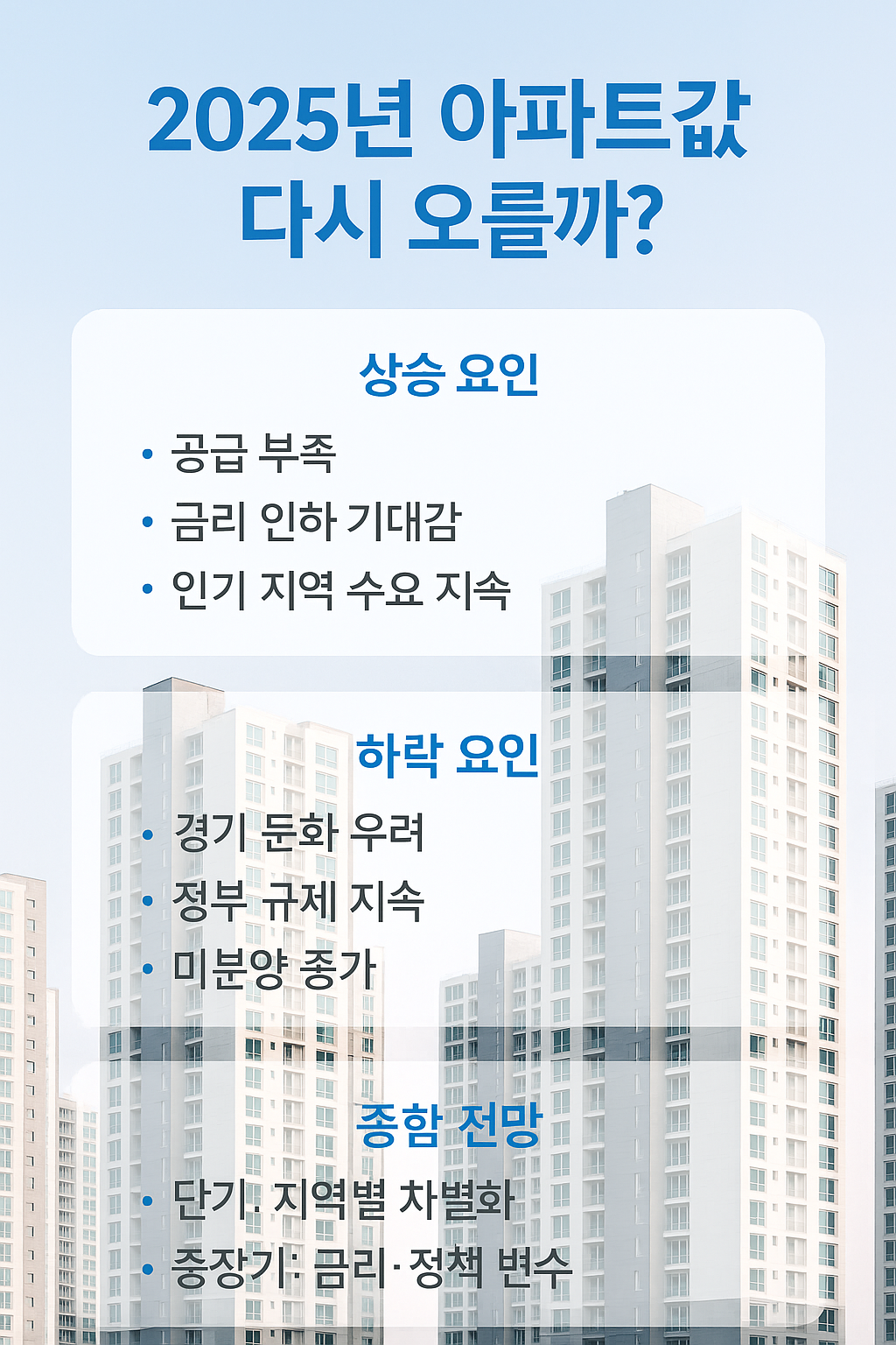 2025년 서울 아파트값은 단기적으로 상승세가 이어질 가능성이 크지만, 장기적으로는 조정과 변동성이 공존할 것으로 전망됩니다.