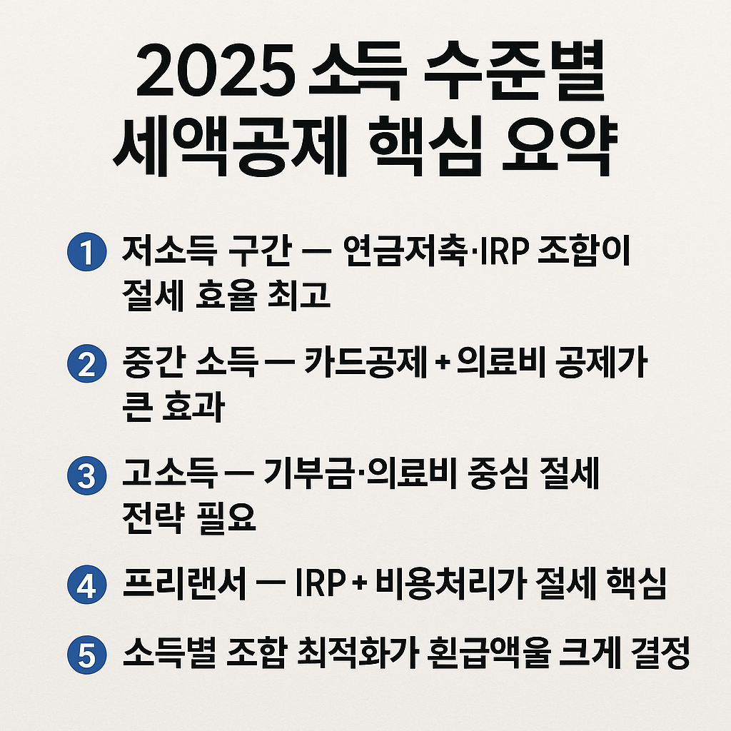 8️⃣ 2025 절세 결론 — 소득별 맞춤 조합이 환급액을 좌우한다